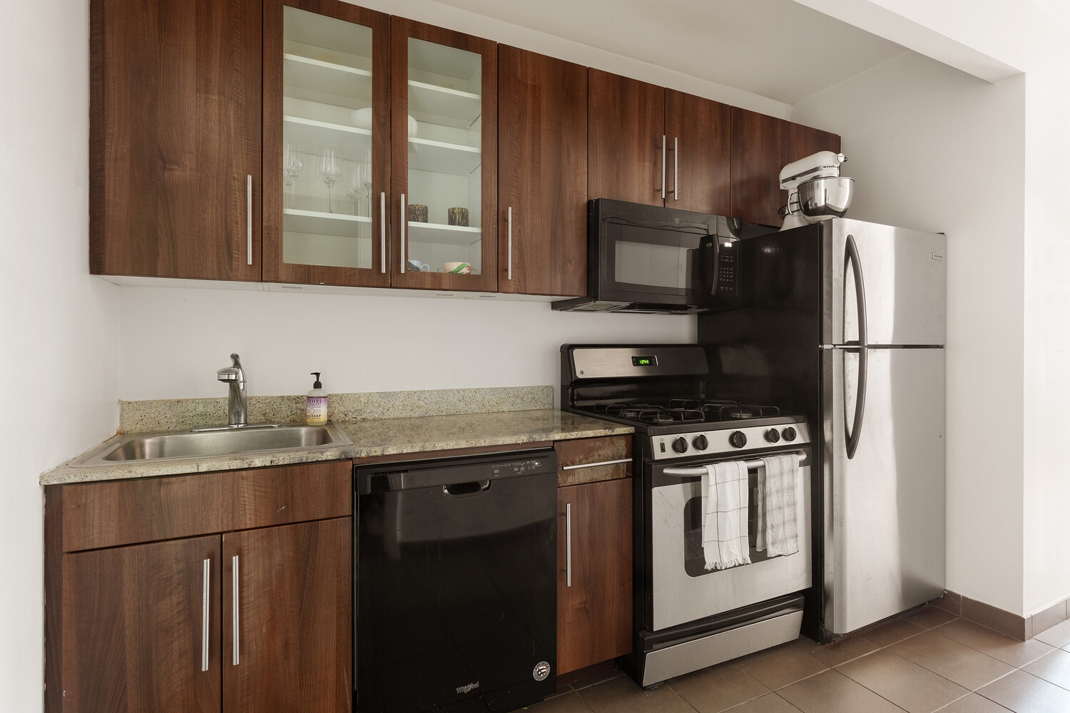 The pass-through kitchen comes fully outfitted with full-size stainless steel appliances - including a gas range, dishwasher, and microwave - along with generous counter space and glass-front cabinetry that offers both style and storage.