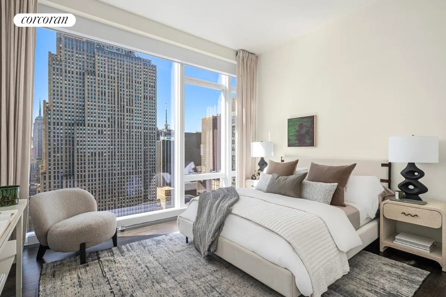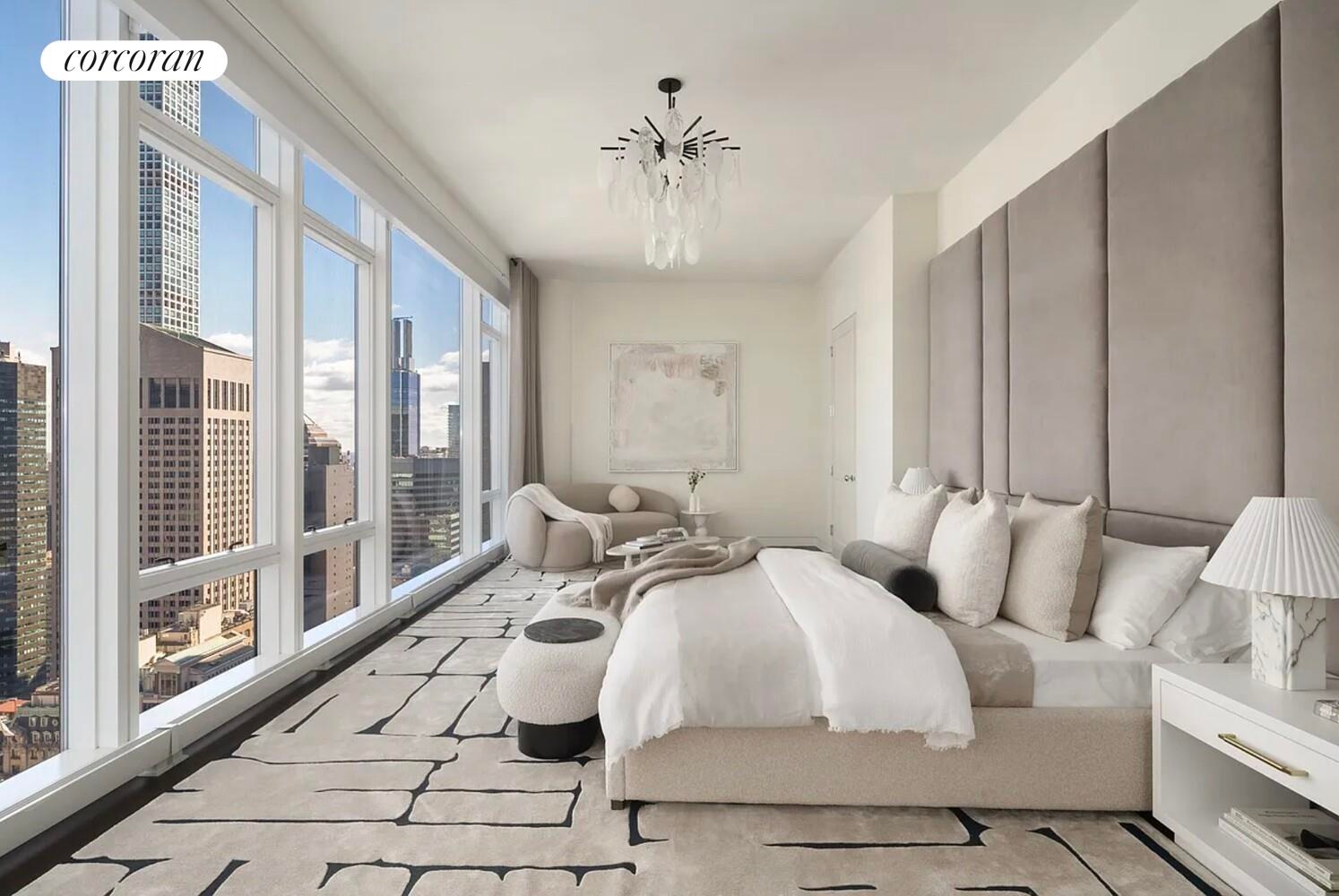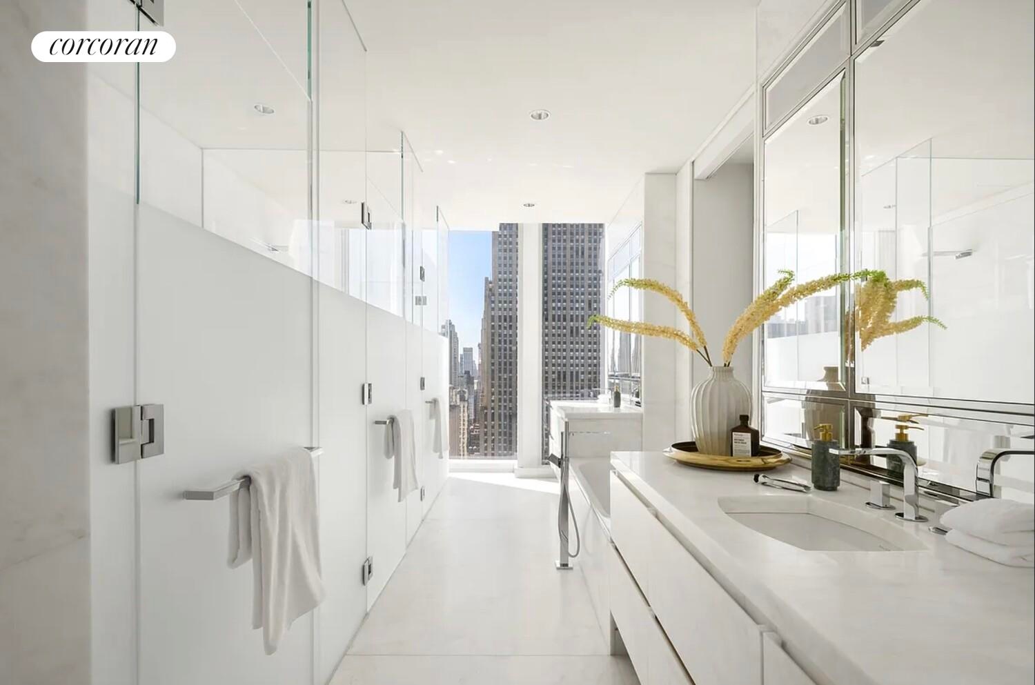 Encompassing 4,545 square feet, this four-bedroom, four-and-a-half-bath home features 11-foot ceilings and floor-to-ceiling windows that frame sweeping, 360-degree views of New York City's most celebrated landmarks - from Central Park and the George Washington Bridge to One World Trade Center, the Empire State Building, the Chrysler Building, and both the Hudson and East Rivers.