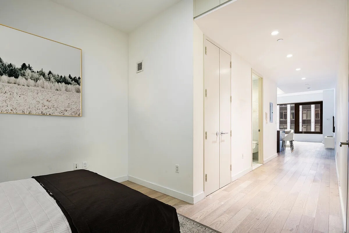 Oversized alcove studio on the 24th floor with south-western exposures, and large windows. Configure as you please with either a home office or a sleeping area distinct from the living-room. Open kitchen with a center island, stone counters, stainless steel appliances. Bathroom with soaking tub and separate shower. Washer dryer inside the unit. Central AC / heat.