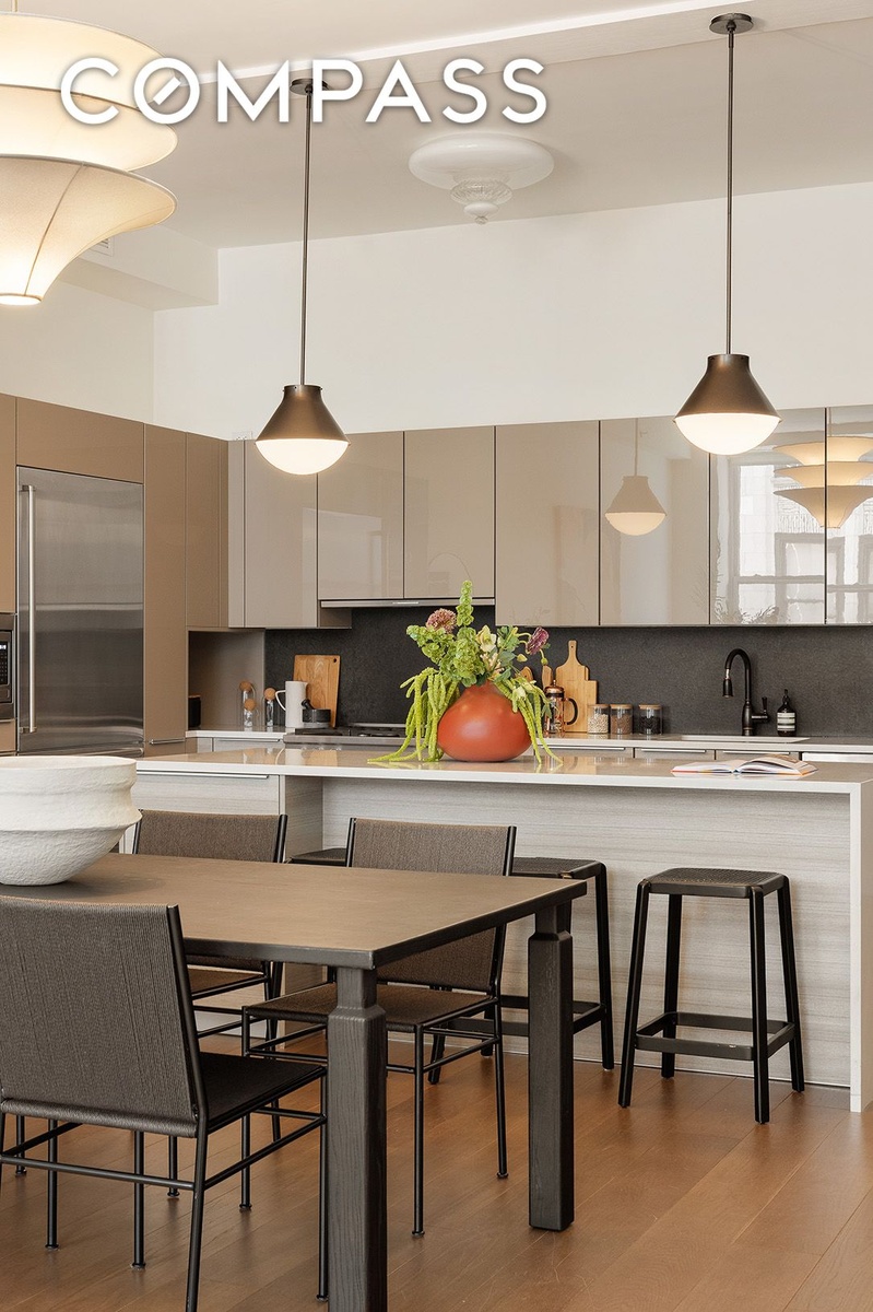 Upon entering the loft, the sense of light and space is immediate. The living room spans approximately 19 x 23 feet, providing ample space for large-scale entertaining and dining. The great room features an open kitchen with Poggen Pohl cabinets, a Sub-Zero refrigerator, and a Miele 6-burner range.