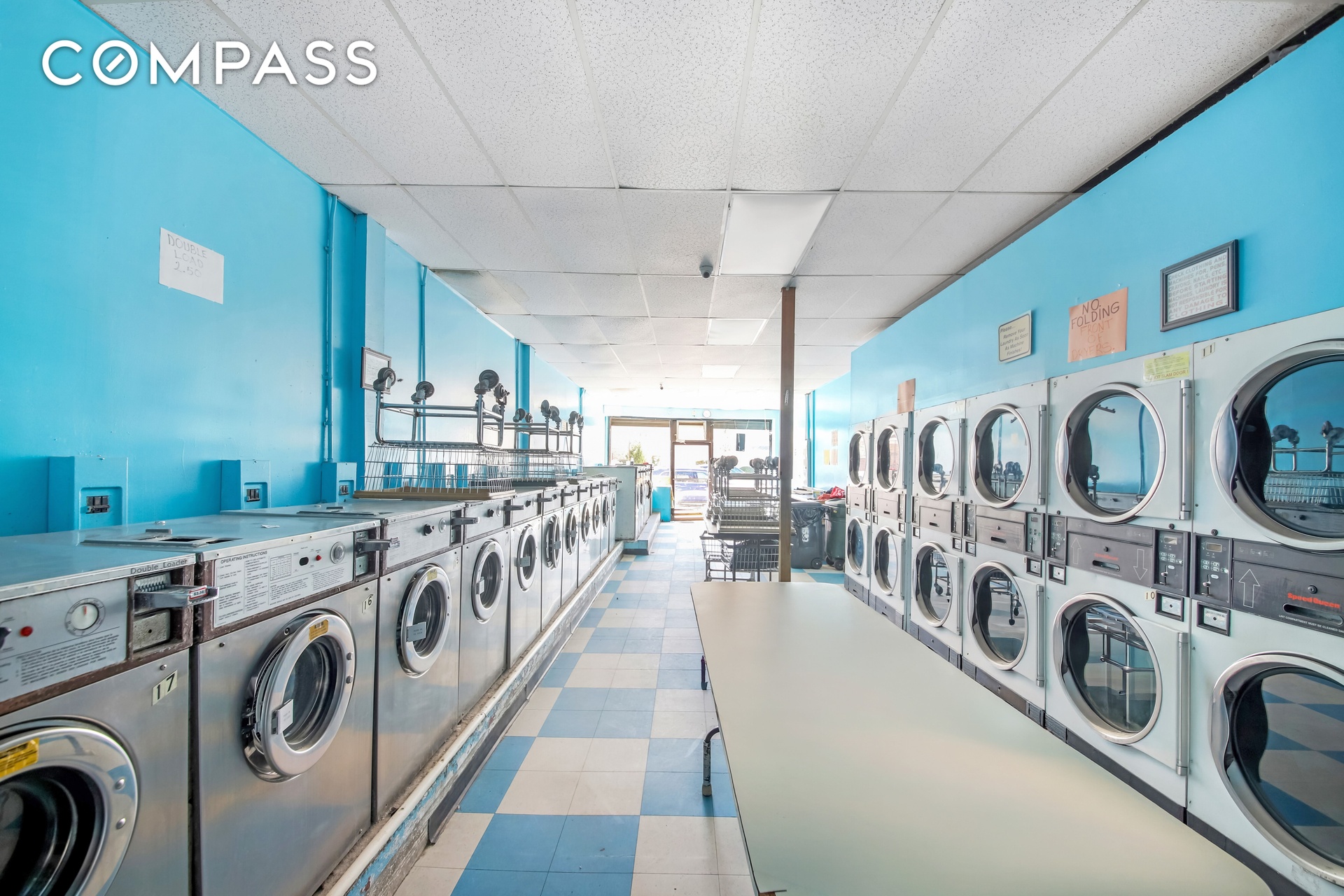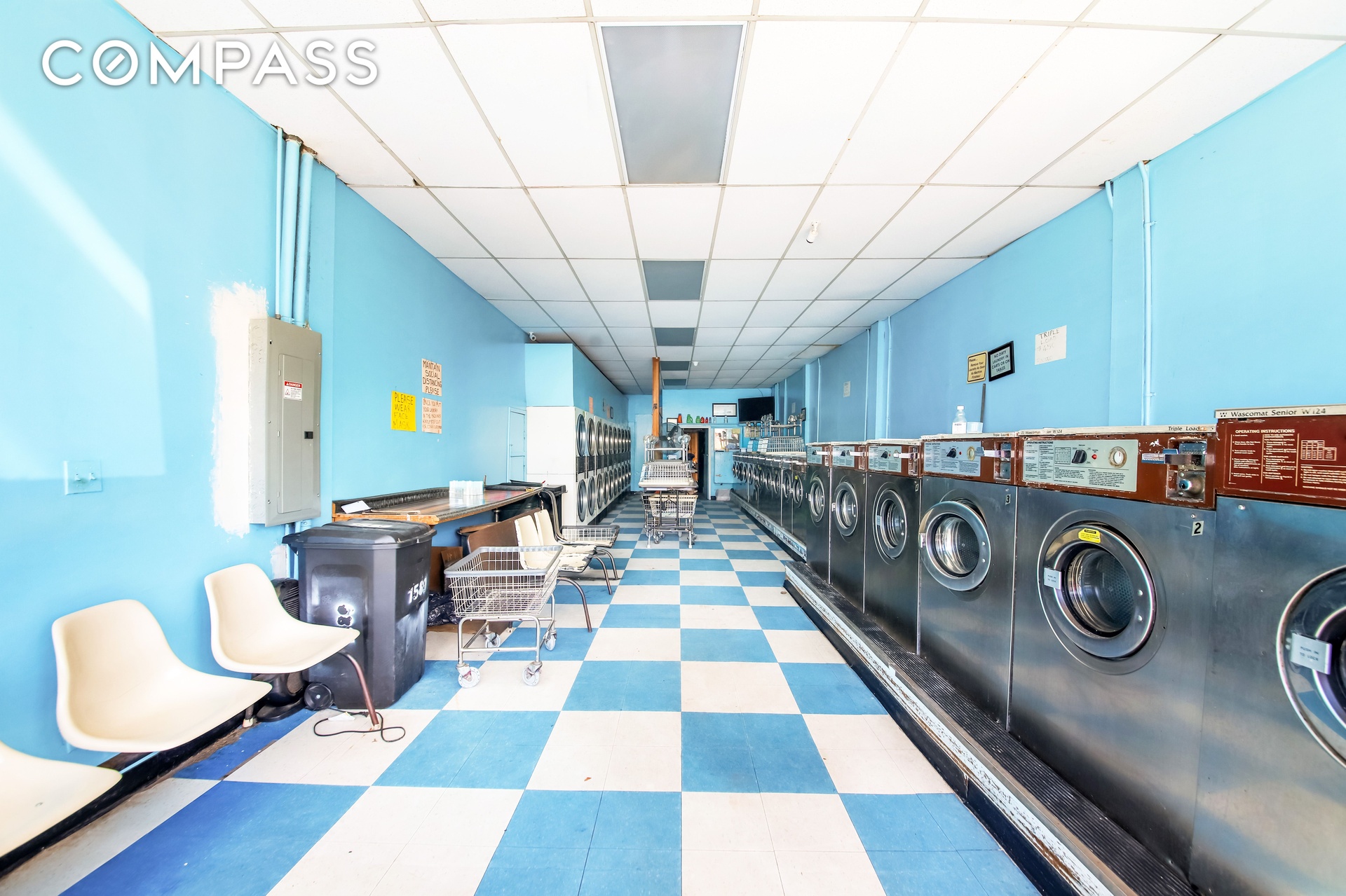 Ground-floor laundromat with 18 washers and 20 dryers