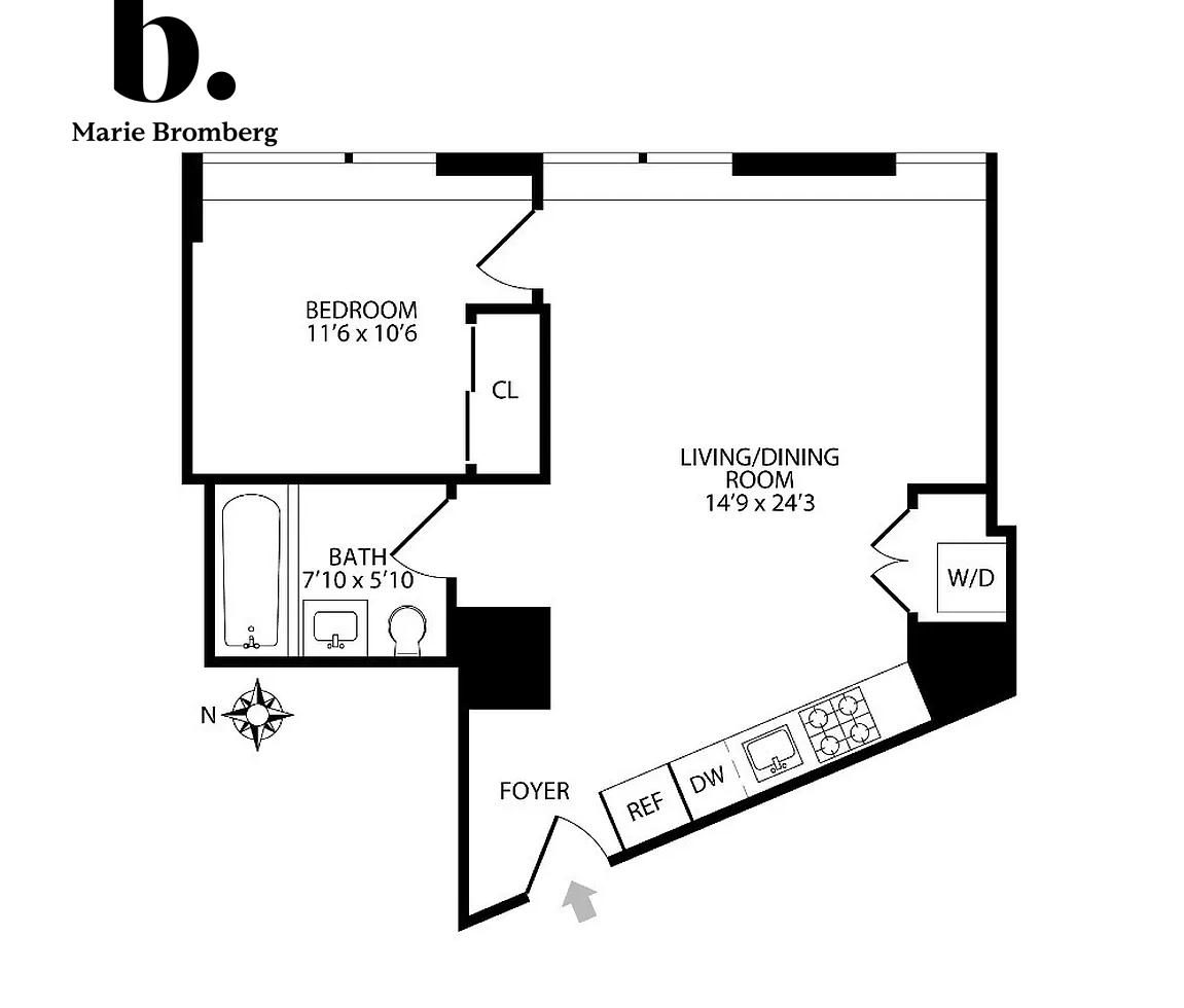 The bedroom provides a peaceful retreat, well-proportioned with excellent closet space and large windows that continue the bright, airy feel of the home. Additional highlights include an in-unit washer/dryer and a spa-like bathroom featuring elegant Villeroy & Boch fixtures and a deep soaking tub.