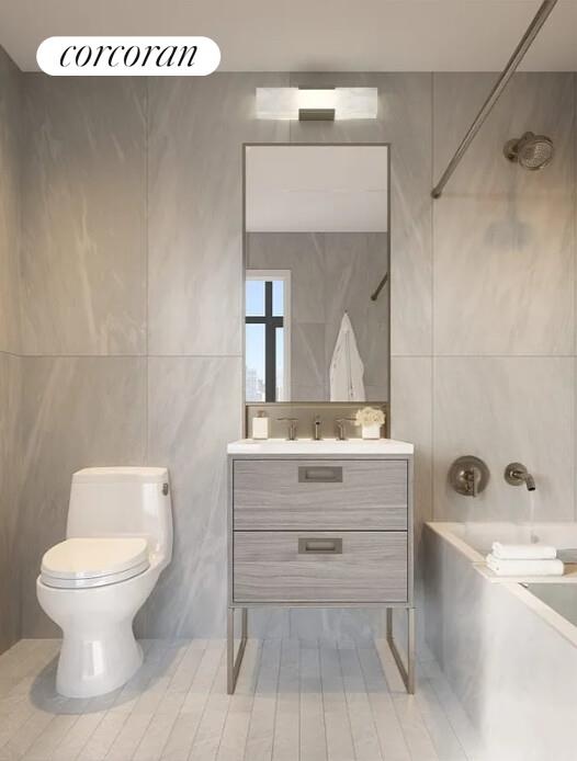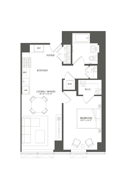 Interior finishes include European white oak engineered wood flooring, generous closet space including a double coat closet, and a spacious bedroom that comfortably accommodates a king-sized bed. The living area is framed by three oversized windows, bringing in natural light and enhancing the overall livability of the home. The contemporary kitchen is designed for both everyday use and elevated cooking experiences, featuring sand ash veneer and matte laminate cabinetry, Viatra quartz countertops and backsplash, a full Bosch appliance package with externally vented range hood, and a Monogram microwave.The bathroom is finished with refined materials, including grey ash veneer and iceberg white marble vanity, Kohler Purist fixtures in light bronze, a custom recessed medicine cabinet, Kohler Underscore soaking tub, Verticyl undermount sink, and Toto Eco Supreme toilet.
