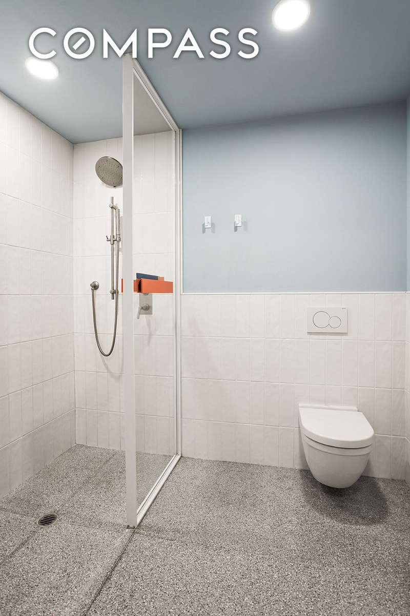 The tranquil bedroom features floor-to-ceiling windows, two generous closets, and the same captivating skyline views, offering a peaceful retreat above the city. The spa-like bathroom is finished with light grey terrazzo flooring, crisp white ceramic wall tiles, a custom vanity topped with Calacatta marble, and sophisticated nickel fixtures by Rohl. A pocket door separates the shower area from the dressing space, enhancing both privacy and flow.