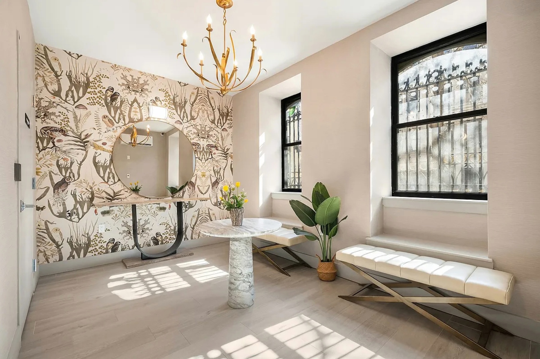 On this tree-lined block, the stately lobby welcomes you with brass, marble, and a custom mural inspired by the neighborhood’s natural landscapes. The furnished rooftop terrace offers sweeping views of treetops, turrets, and Hudson River sunsets. Additional amenities include private storage and a virtual doorman.