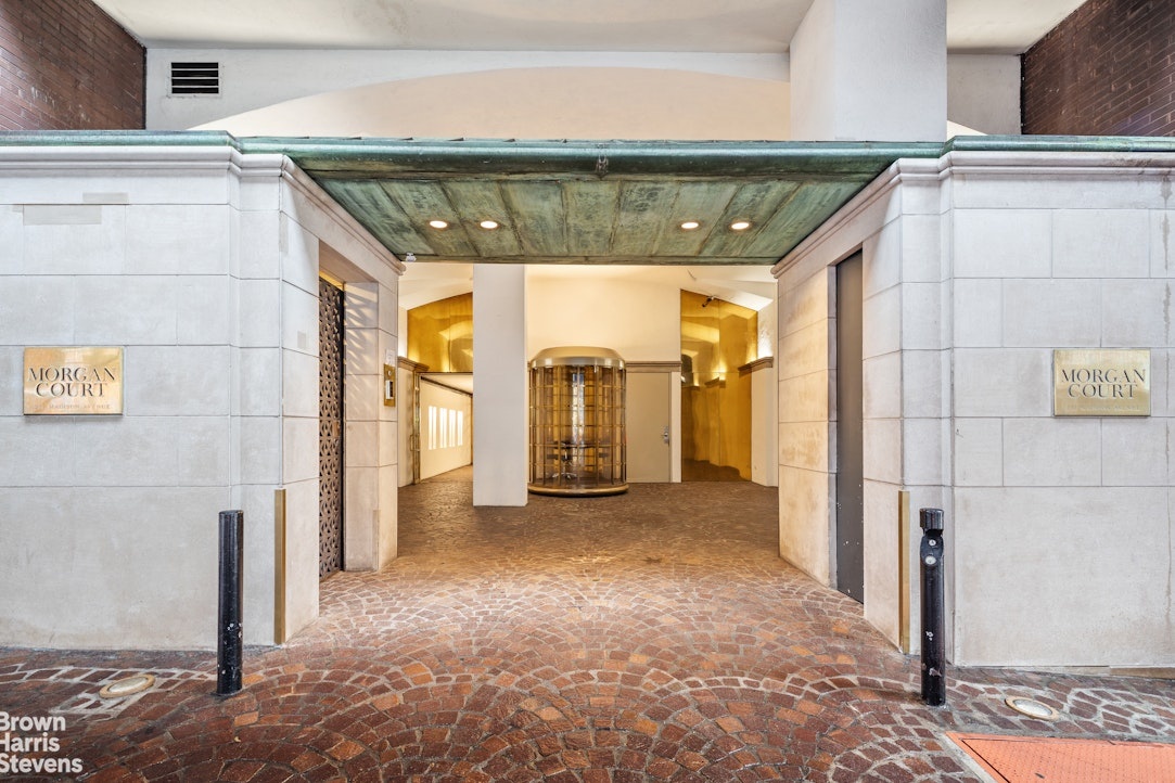 Enter Morgan Court through a charming cobblestone courtyard to a bright and modern lobby, where a full-time doorman awaits to greet you. Step outside to discover a serene landscaped inner courtyard with a reflecting pool and view of the original Tiffany windows on the Church next door, providing a tranquil oasis in the heart of the city.