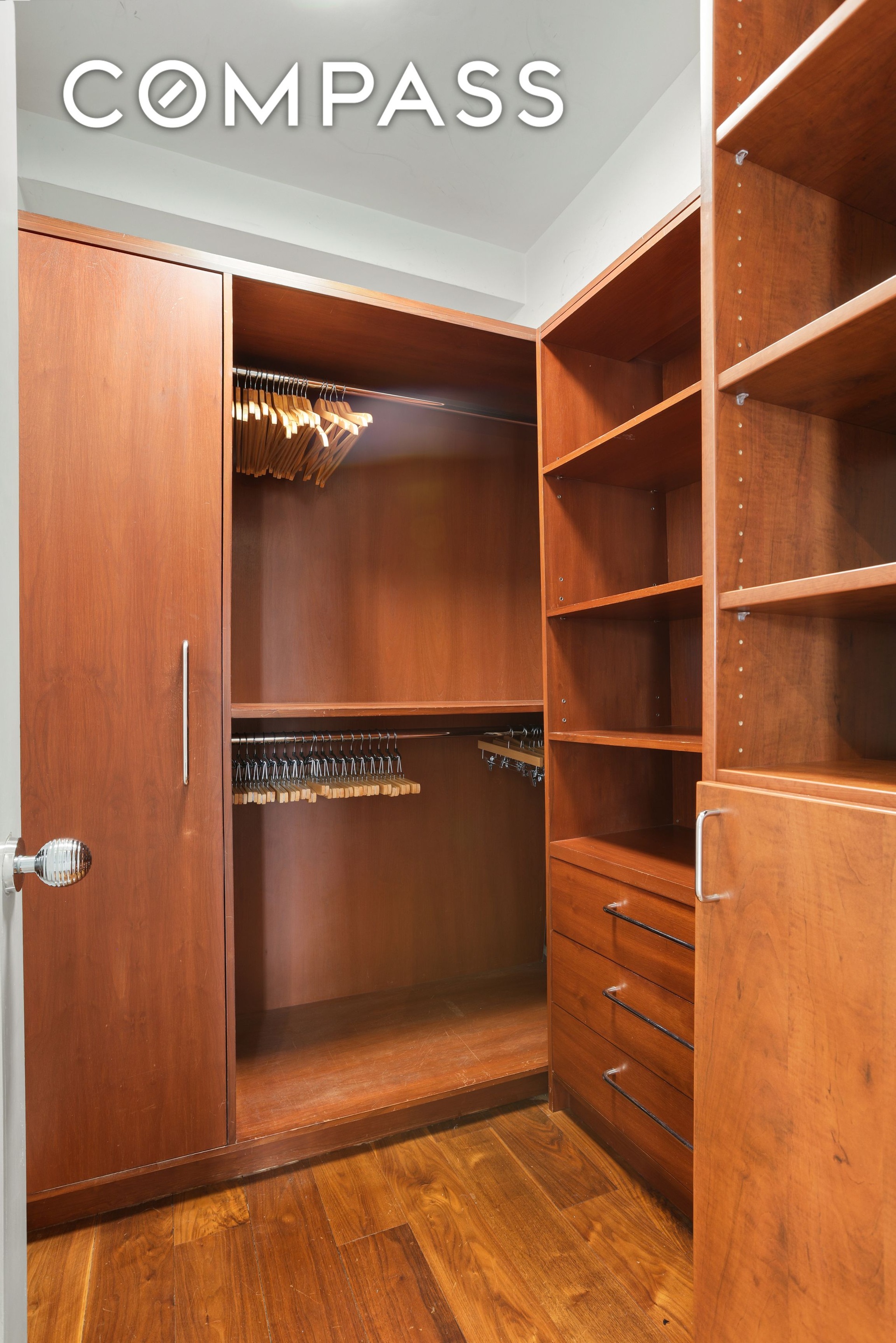 Impeccably designed to maximize both space and livability, the home opens through an entry foyer featuring a custom-built marble credenza. To your left, a walk-in dressing room with a full California Closet system leads to a beautifully appointed bathroom finished with imported European tile.