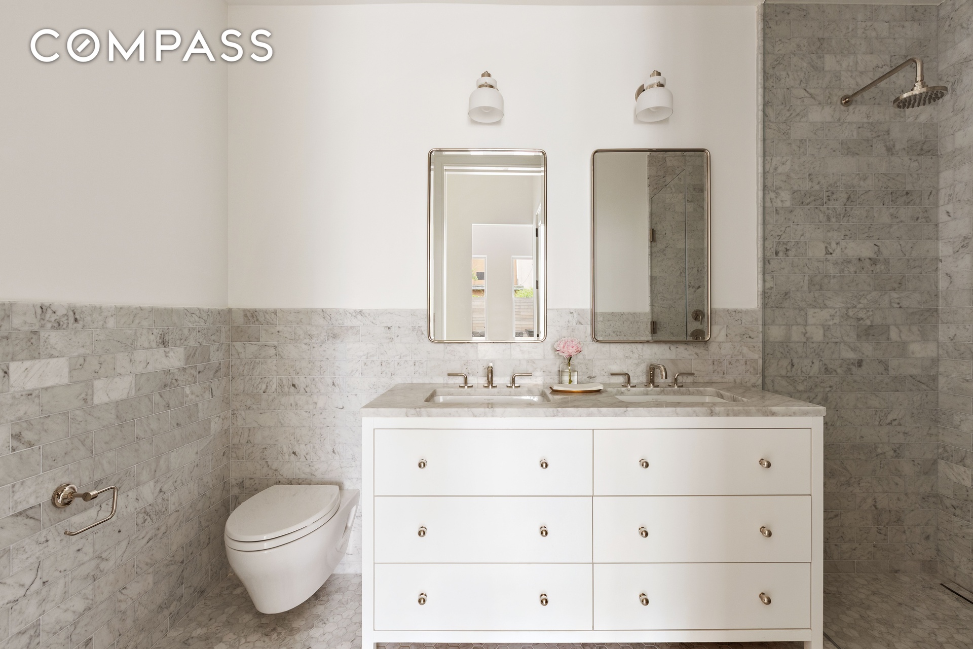 On the expansive lower level, the large rec room is perfect as a family room, home gym, office , or all of the above . A second powder room and a laundry closet with an in-unit Bosch washer-dryer add wonderful convenience and livability to this all-new Brooklyn residence.