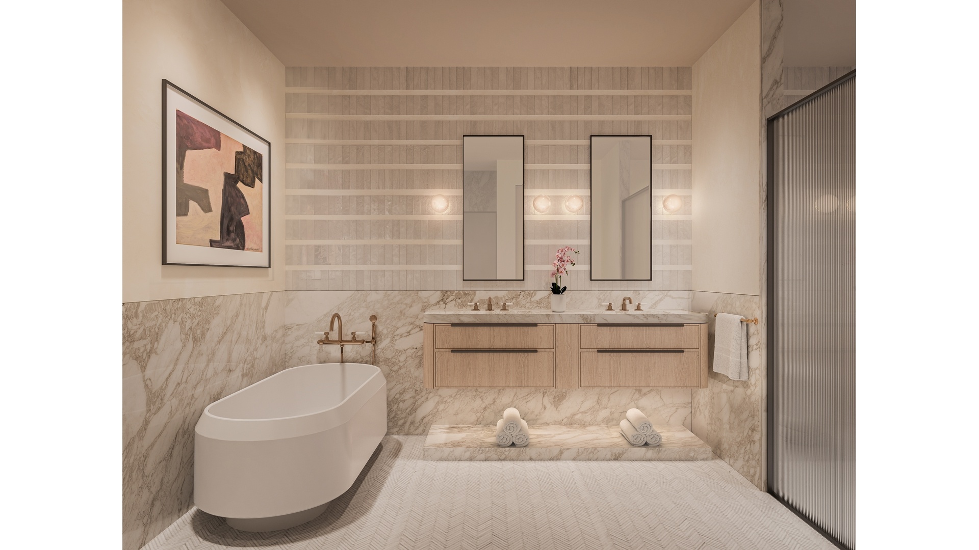 Just beyond the living spaces, awaits the primary bedroom, with two large walk-in-closets, and a spa-like five-fixture bathroom, featuring glazed porcelain tile and honed Calacatta Vision marble, along with a dual white oak vanity illuminated by custom sconces and topped with matching marble counters. The primary bathroom also includes a freestanding tub by Apollo, as well as a spacious shower with a Calacatta Vision marble feature wall and a fluted glass enclosure.