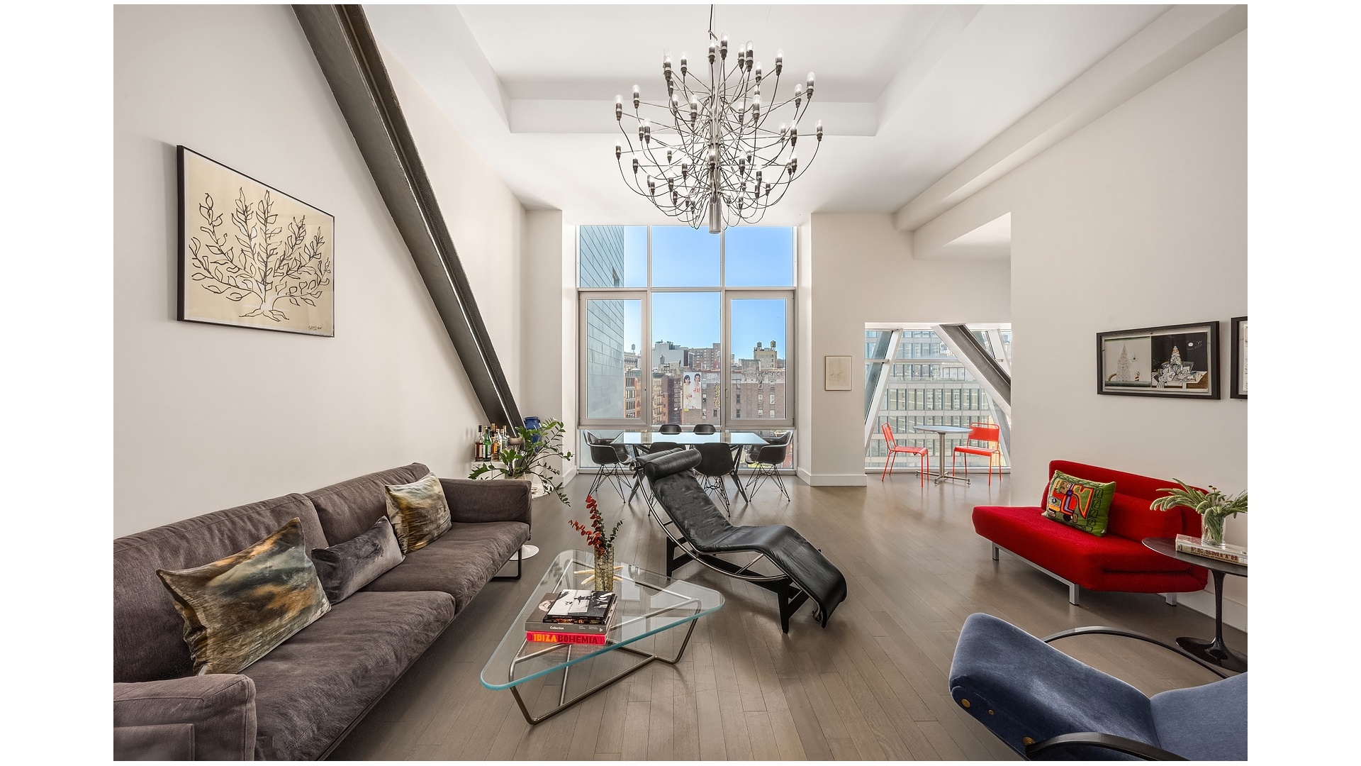 A private keyed elevator opens directly into this striking full-floor residence, where soaring 13-foot ceilings, exposed steel trusses, and walls of floor-to-ceiling glass create a loft-scale living experience rarely found in downtown condominium living.