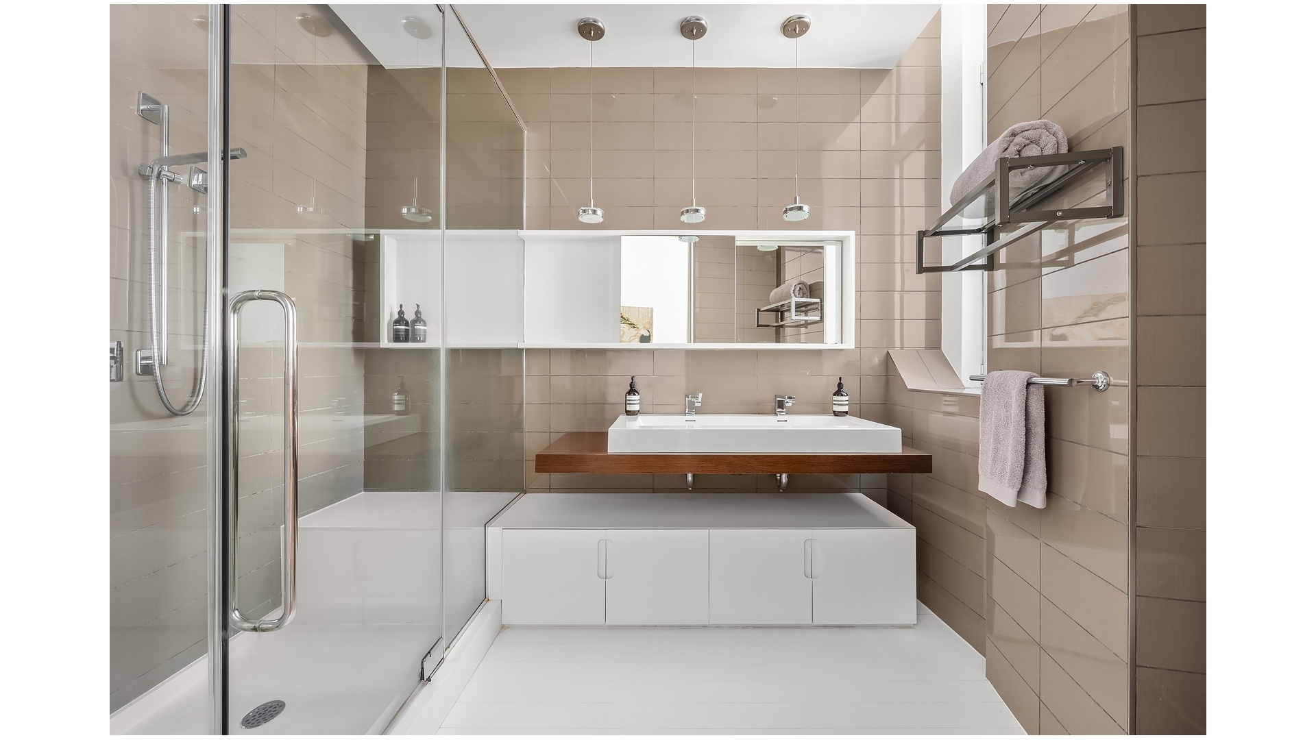 The primary suite is privately positioned within the residence and offers a serene retreat with custom closets and a spa-inspired en-suite bath featuring a double-wide vanity, Corian floors, and a Kohler rain shower with built-in bench. Floor-to-ceiling windows facing north and east capture sweeping Midtown skyline views, including the iconic Chrysler Building.