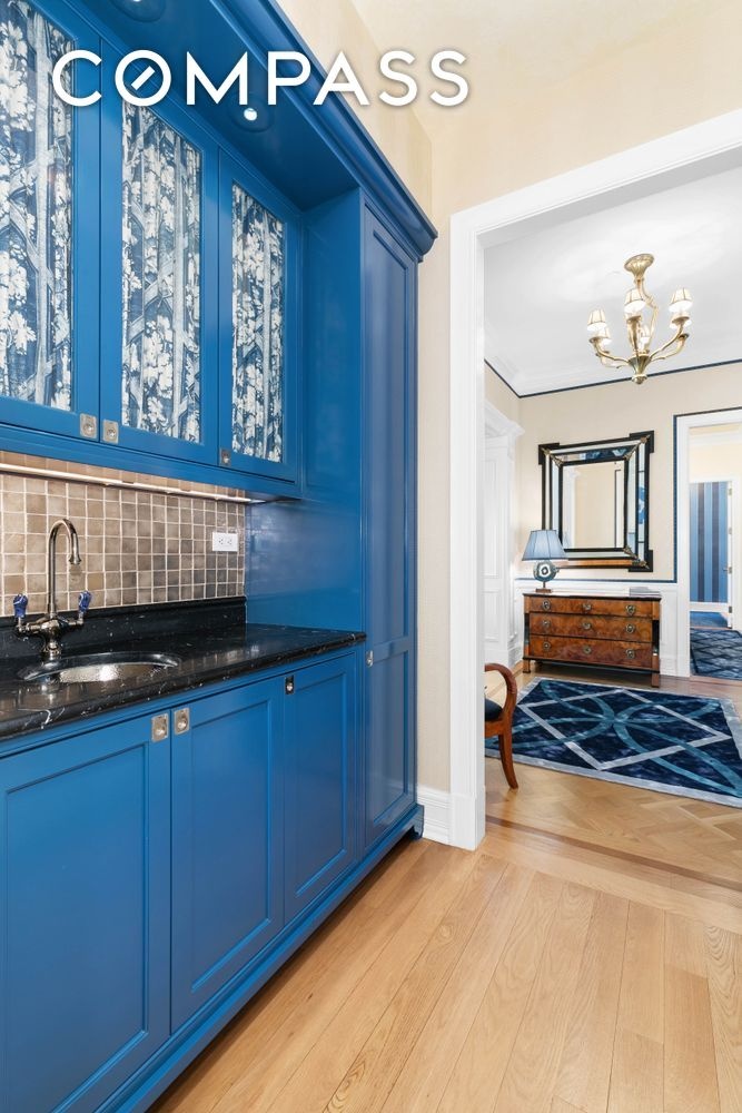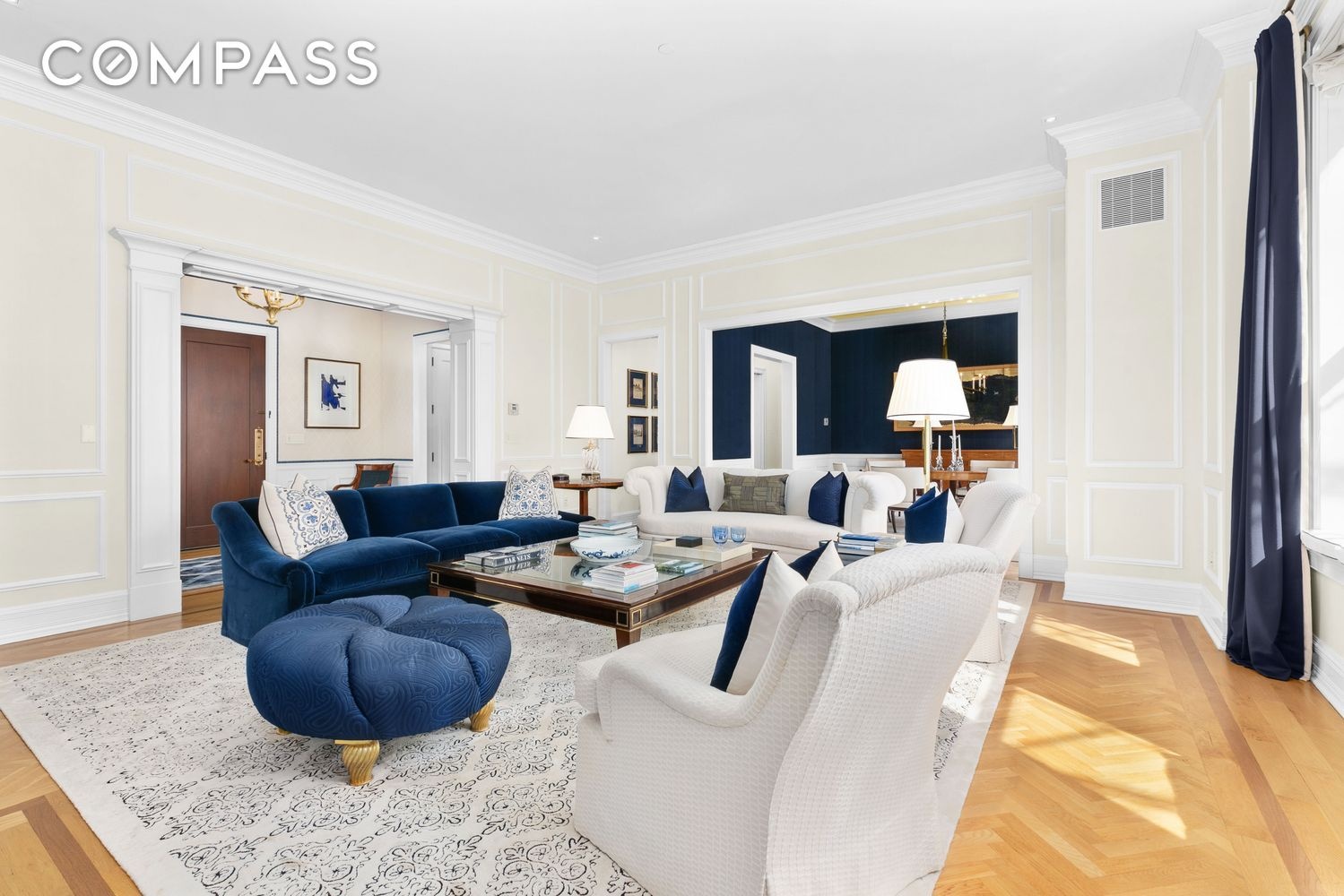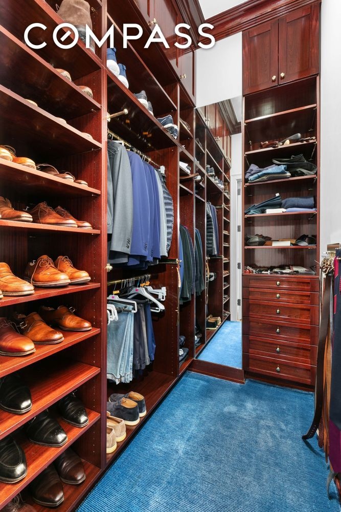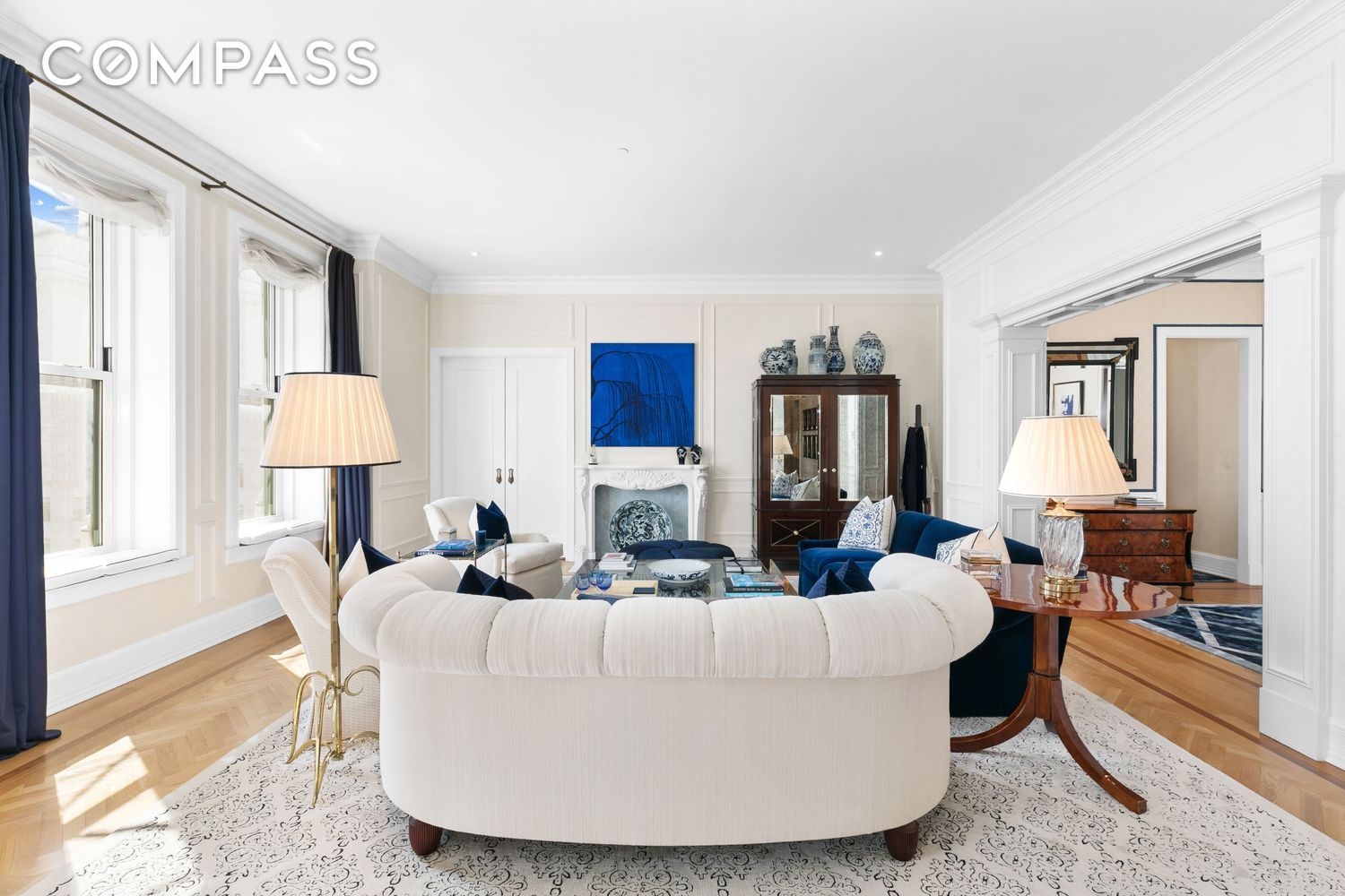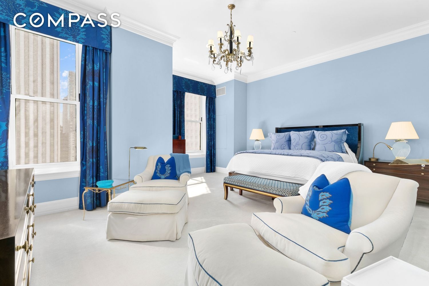 The oversized primary bedroom has a walk-in closet and an en-suite marble bathroom outfitted with Kohler soaking tubs, separate shower stalls and double sinks, mosaic patterned floor replicating the floor of the original Plaza lobby. The primary bedroom is large enough to fit a seating area, has two additional closets, and oversized windows with eastern exposures. The second bedroom or library is complete with custom leather walls, a fireplace, and oversized windows facing east.