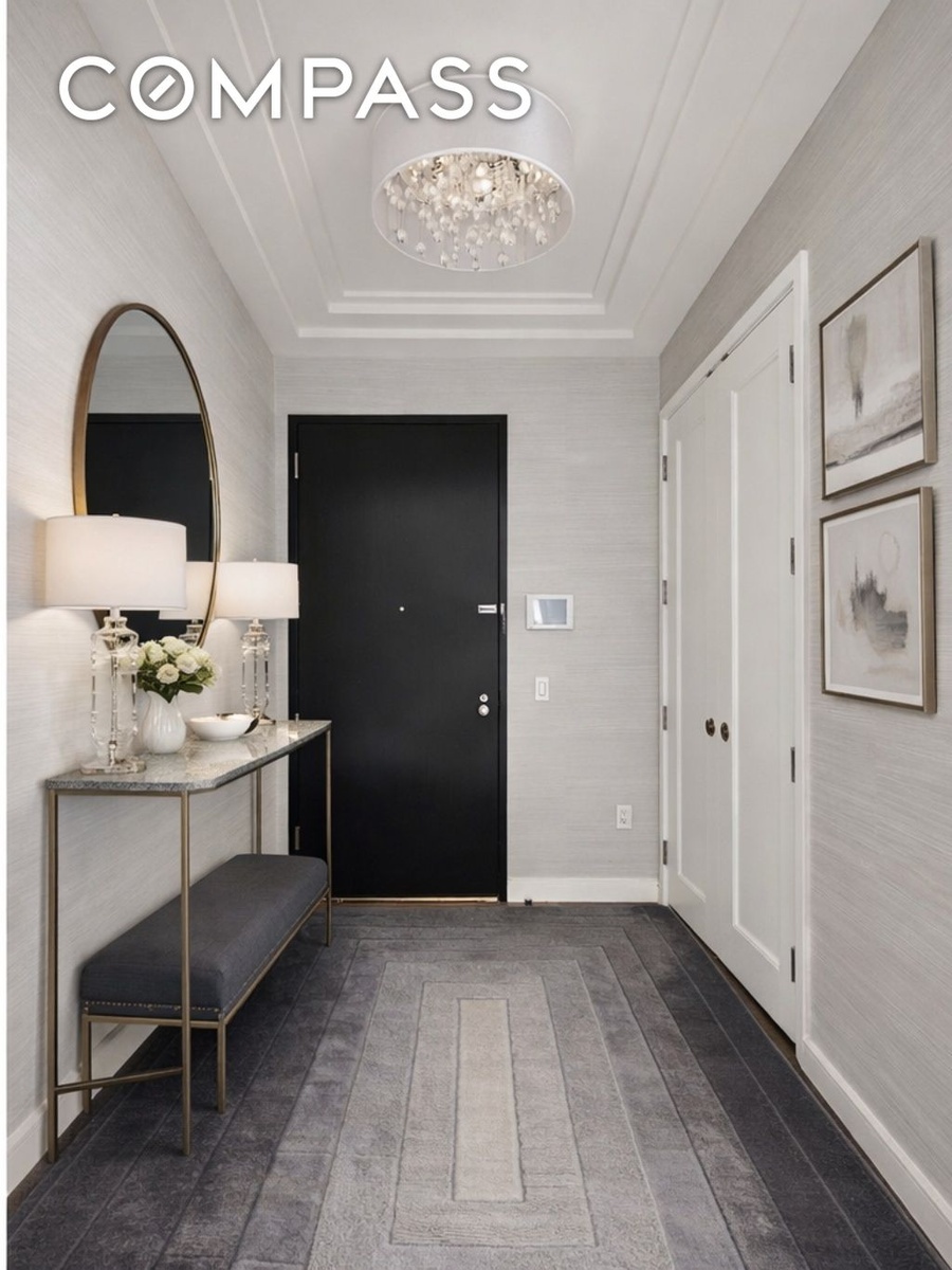 A welcoming entry foyer opens into a striking open-concept living and dining space, where expansive tilt-and-turn windows capture sweeping western outlooks toward the Hudson River. Sunlight floods the interior, creating a bright, inviting atmosphere across both the living area and primary bedroom.