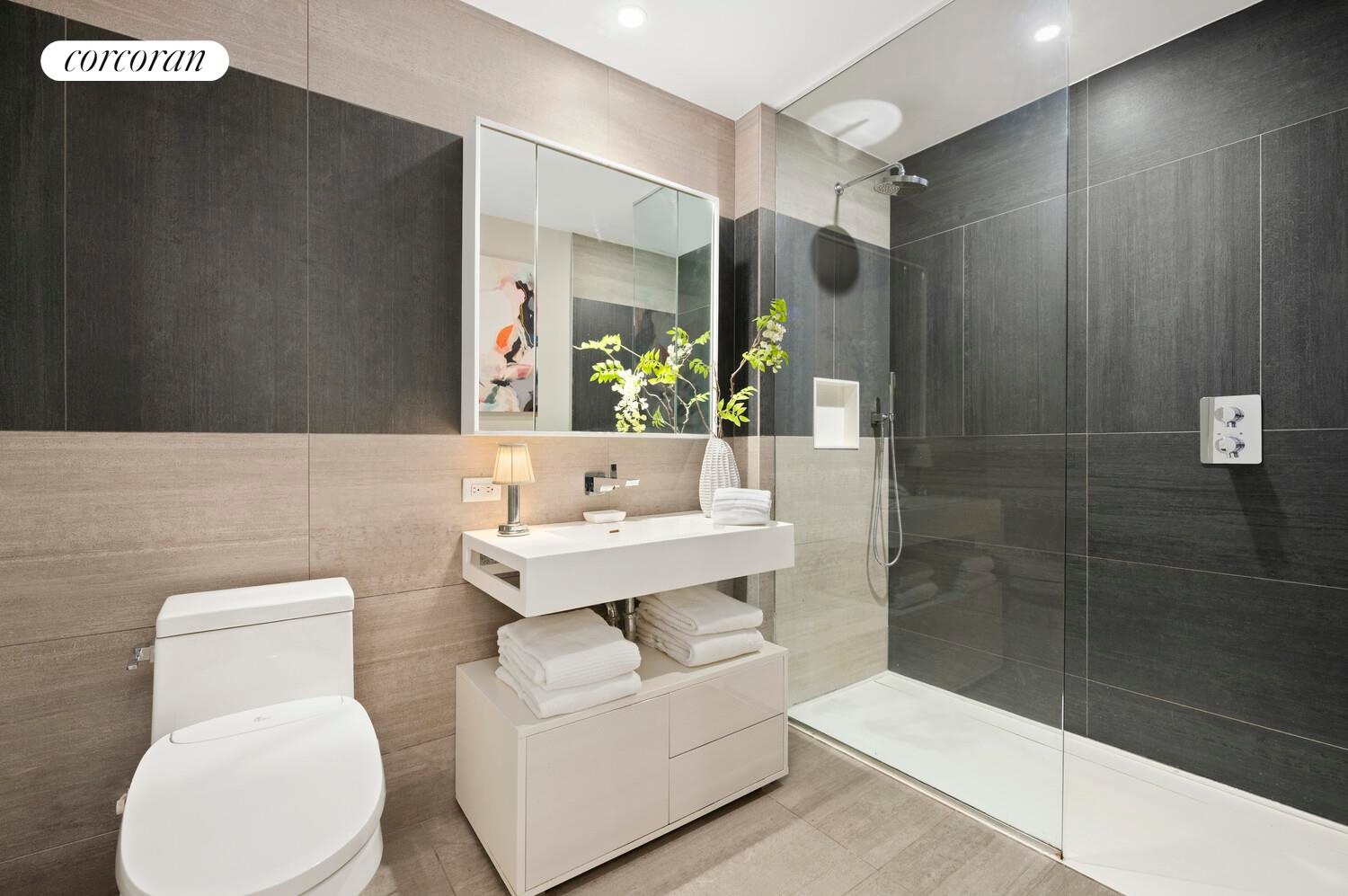 The Primary Bathroom features a large walk-in shower with a Newform rainfall showerhead and handheld. There is imported Italian porcelain tile throughout the bath area.