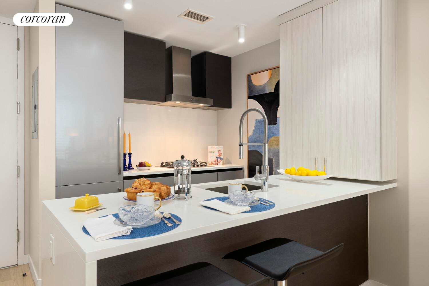 You're going to LOVE living at 540 W. 49 St., Apt 608N! First, let's acknowledge that this unit has everything you would expect in a modern condo: you have gorgeous southern light coming in all day, over-sized double-paned floor-to-ceiling windows, beautiful (expensive!) Hunter Douglas electronic blinds, premium appliances, handsome white oak floors, a Bosch Series 800 washer/dryer and central heating/cooling. This home happens to be the largest and highest one-bedroom, one-bathroom in the building, 801 sf with 9-foot ceilings!