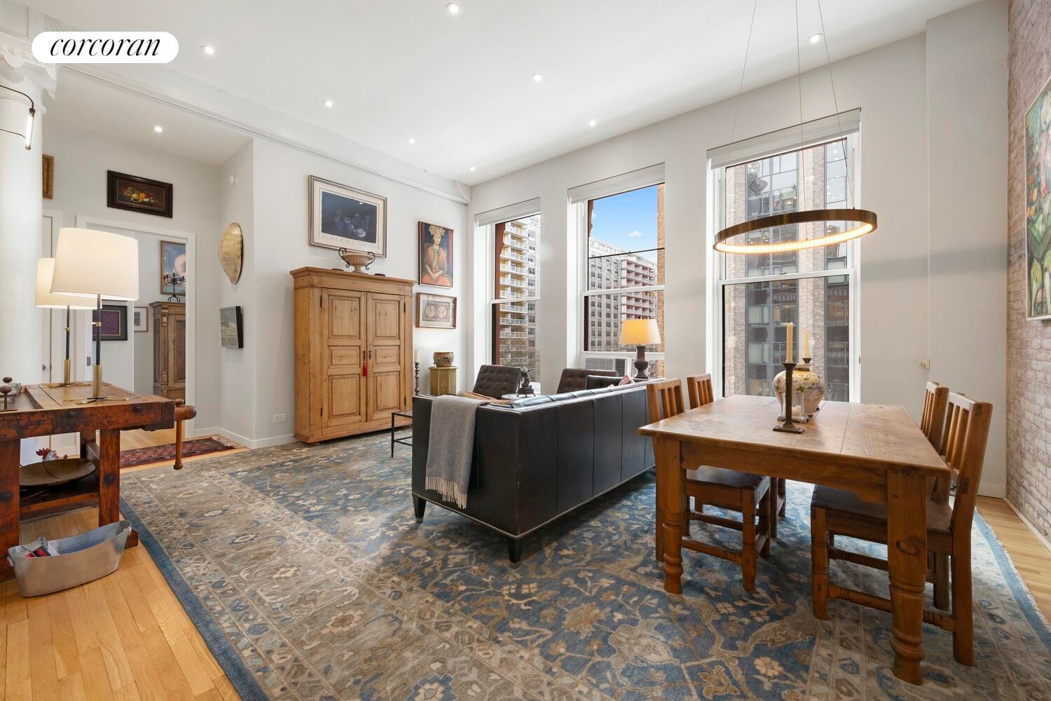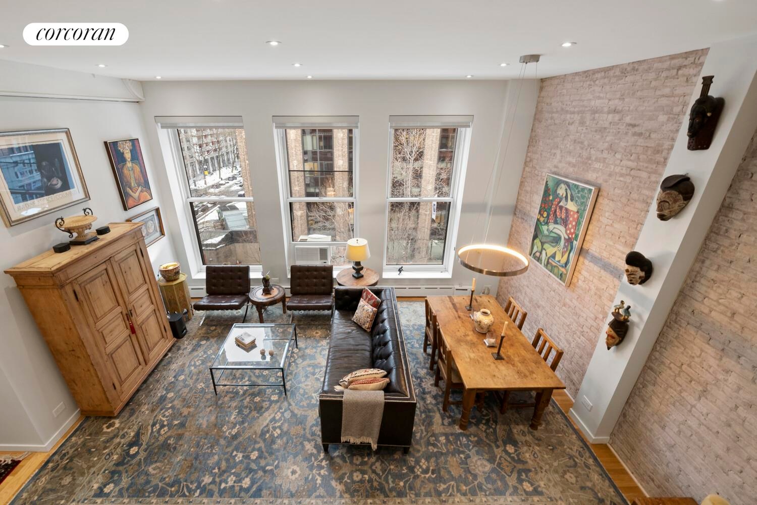 Entering the main living space there are three 10-foot x 4 feet windows with custom Glasso windowsills, an updated heating system, hardwood floors and exposed brick. This space is great for entertaining or a quiet night in. The ceiling height is impressive at 12.5 feet high making the apartment extra spacious.