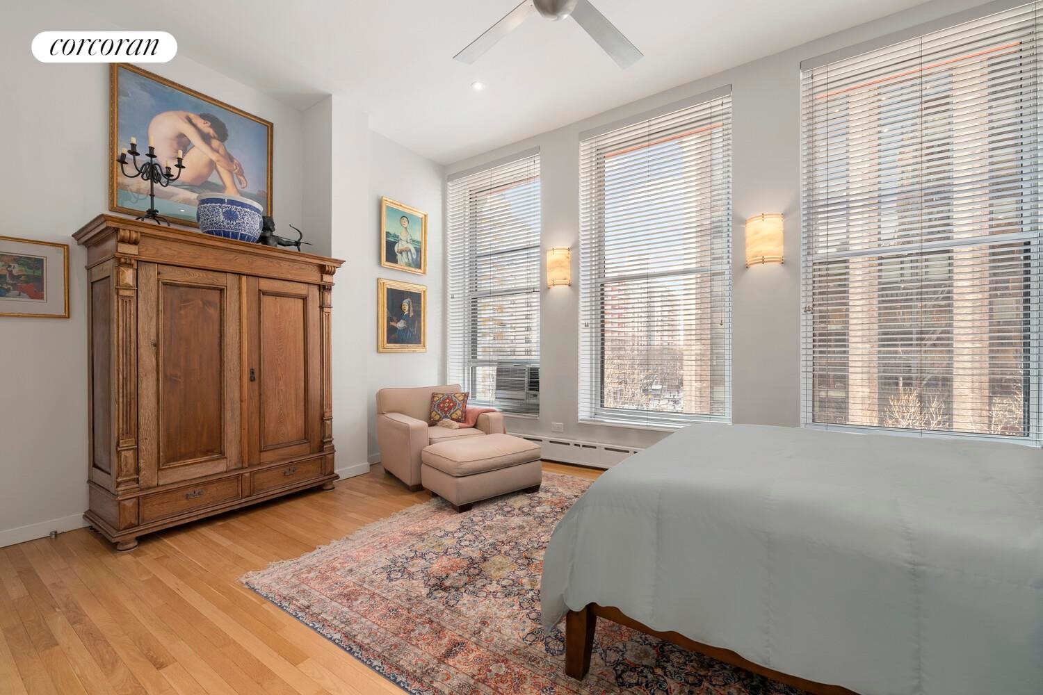 The bedroom is a generous size with three large windows again. It can accommodate a king size bed. The large double closets are designed by California Closet Systems. Plus, extra storage above.