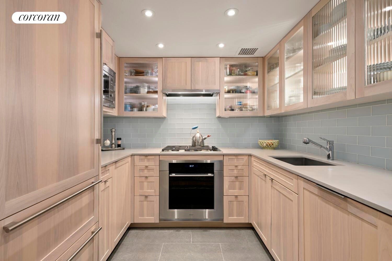 The kitchen is modern and super friendly for avid cooks. High-end appliances await, Subzero refrigerator, Wolf cooktop and oven, Miele dishwasher finished off with gorgeous custom cabinets. And a separate custom pantry.