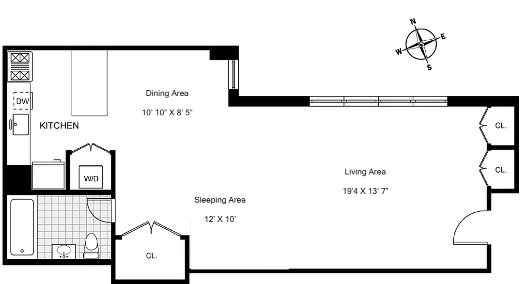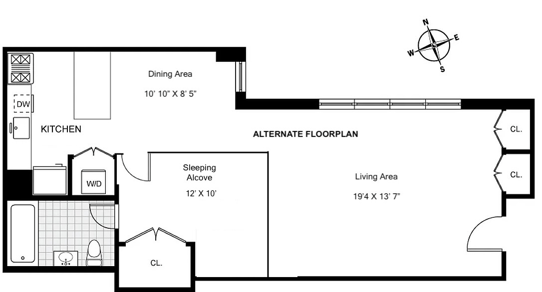 Spanning a generous 758 square feet, the sheer scale of this open loft-style studio easily accommodates an enclosed sleeping alcove while maintaining its open-concept flow.