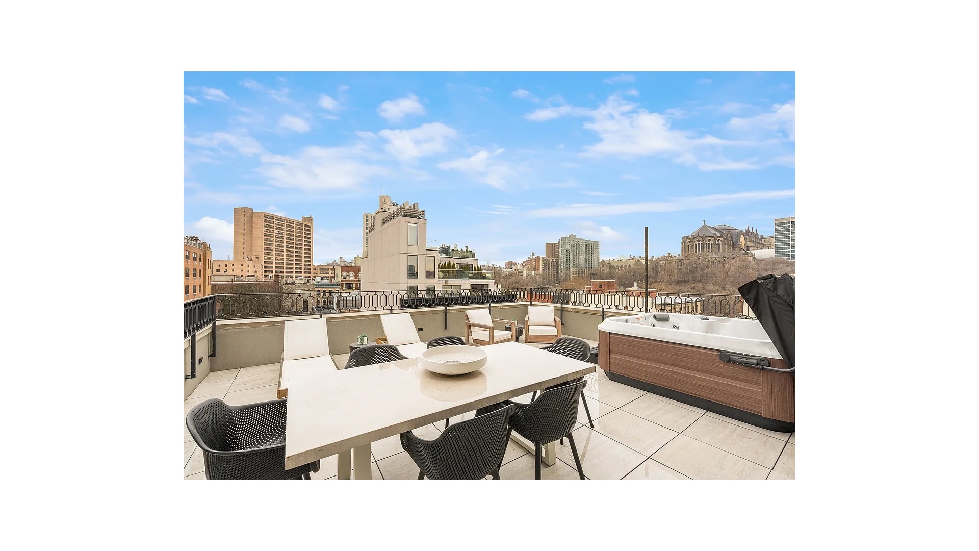 The main level (6th floor) hosts two bedrooms and two full baths, lower level (5th floor) boasts two additional south-facing bedrooms, a dual-vanity full bath, and an expansive walk-in closet. Two sprawling terraces with breathtaking views of Morningside Park, South Harlem, and St. John the Divine. Designed for both relaxation and entertainment, the terraces are equipped with water, power, and a hot tub.