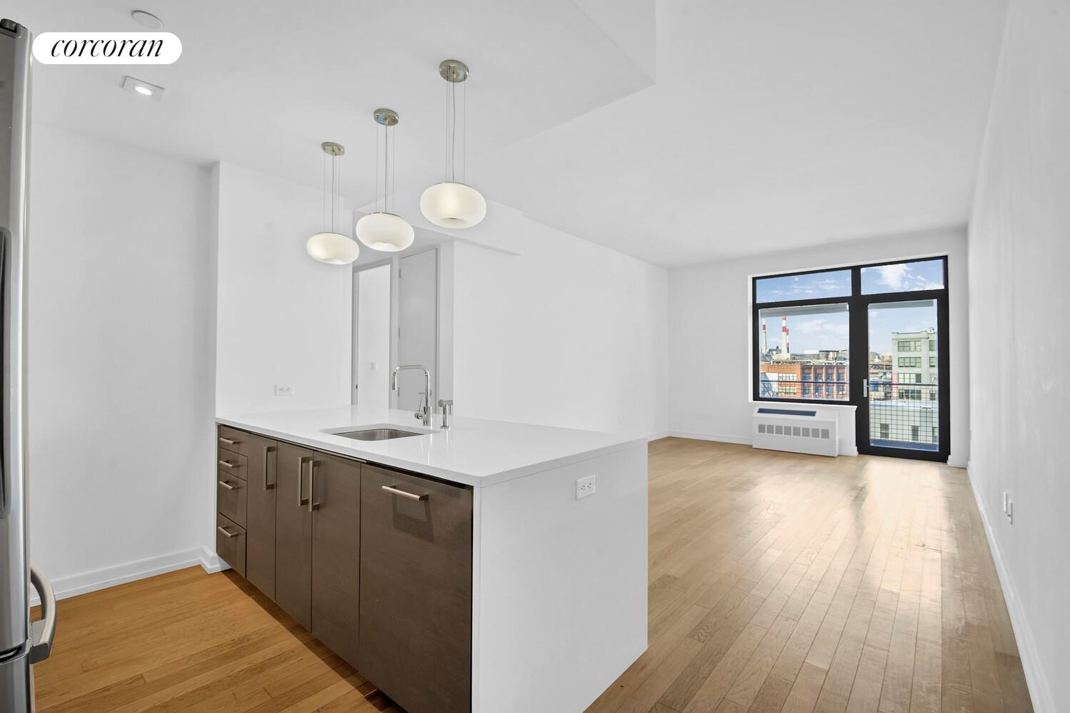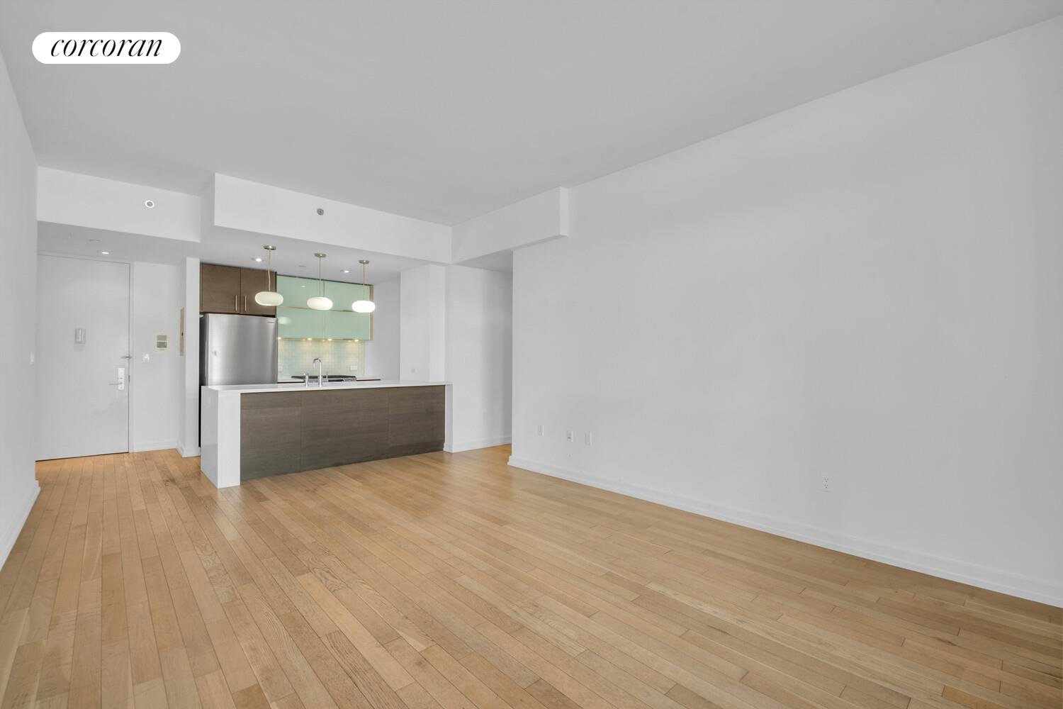 The spacious open-plan living room flows perfectly onto the large balcony where you can quietly enjoy the views. The fabulous open chef's kitchen has everything you need including high-end stainless steel appliances, an abundance of counter space and a white quartz island that can be used as a breakfast bar. The bedroom fits a king-size bed and more. In-unit Bosch Axxis washer and dryer.