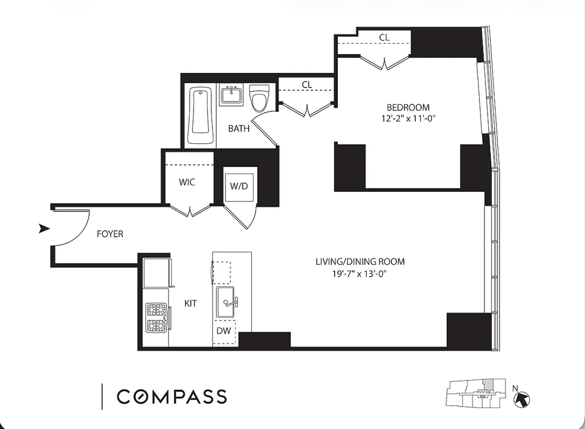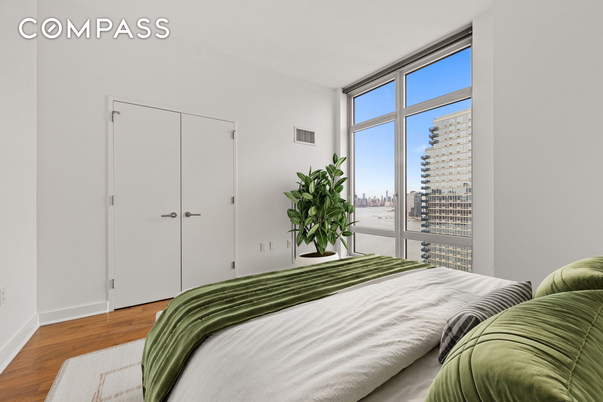 The bedroom features floor-to-ceiling windows with direct views of the Manhattan skyline — the kind you wake up to and never get sick of — along with a generously sized closet. The bathroom delivers a spa-like finish, and an in-unit washer and dryer rounds out the practical side of the package