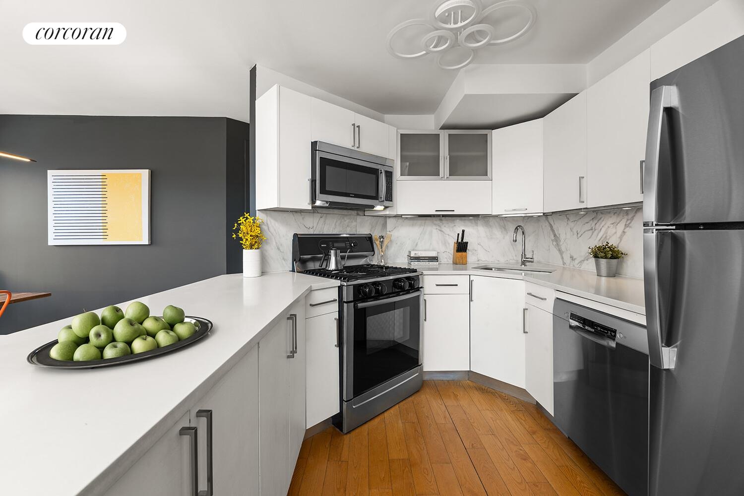 Back inside, the kitchen features Silestone countertops, a marble backsplash and a full suite of stainless steel appliances including a new fridge this year and a new dishwasher in 2023. There is a breakfast bar for additional counter and storage space, and clever under the stair closets act as an additional pantry and home for the combo washer/dryer installed in 2024. The adjacent dining area is also of good size and can easily accommodate eight at your next dinner party. Beyond the great room is a full bath and a well sized bedroom nestled quietly in the back. Another lovely balcony overlooking the gardens below and the city skyline beyond completes this main floor.