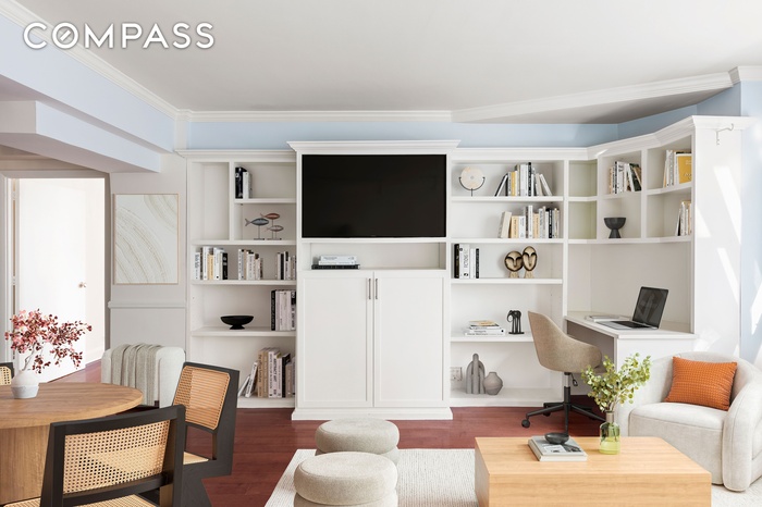 Upon entering, you'll be greeted by a sizable living room adorned with carefully crafted built-ins, providing ample space for a TV, bookshelves, storage, and even a corner desk for your work-from-home needs. The living area accommodates a generous alcove sofa and offers flexibility for a small dining area or kitchen counter seating. A convenient half bath for guests ensures optimal privacy, complemented by two hallway closets and a "last look" mirror strategically placed in the entrance.