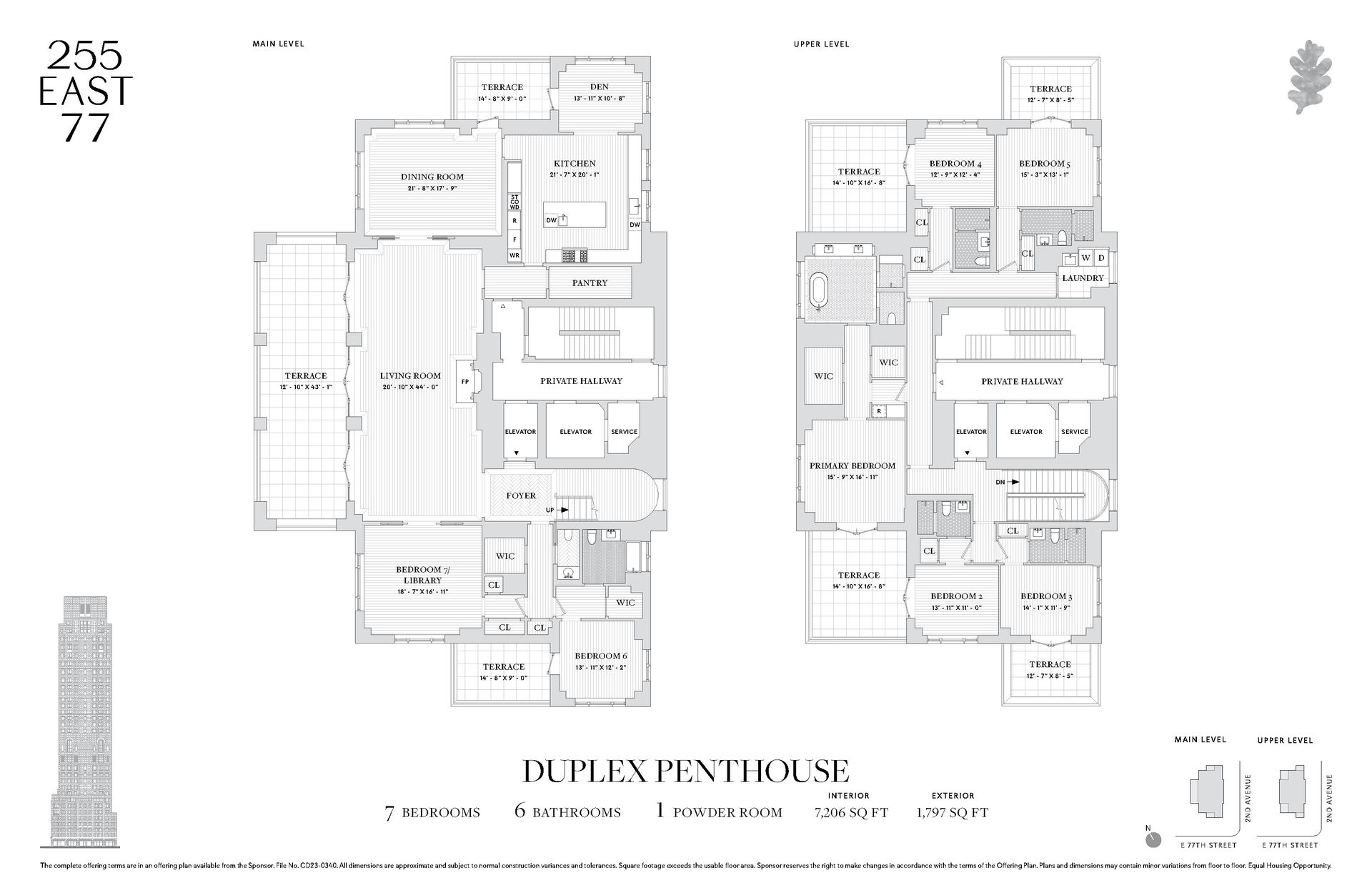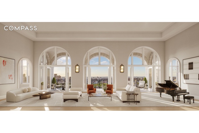 Crowning 255 East 77th Street with an array of dramatic private terraces, this beautifully designed duplex penthouse is a seven-bedroom, six-and-a-half-bathroom residence that balances monumental scale with refined elegance. The sweeping main level hovers above the cityscape, where a formal dining room, a refined library, and a grand living room extend effortlessly onto expansive private terraces, offering an extraordinary sense of scale and light. The kitchen, complete with a pantry and adjoining den, provides seamless flow for both daily living and entertaining. The separate upper level features a sprawling primary suite and distinct bedroom wings that offer absolute privacy, along with serene outdoor retreats boasting open exposures in every direction, including Midtown, Central Park, and river views. Every detail, from the discreet private elevator access to the bespoke, light-filled layout, reflects timeless design and modern luxury. The design of the residences at 255 East 77 is contemporary, honoring classicism with a fresh approach. Abundant light streams in, complementing the tailored interiors that are anchored with pristine white oak flooring. The commitment to design excellence can be felt in each room and at every opportunity, especially in the kitchens, which feature honed Calacatta marble countertops and backsplashes and marry state-of-the-art technology, top appliances (Miele and Sub-Zero) and beautiful craftsmanship. Primary bathrooms feature custom stone floors, Bianco Dolomite marble walls, and vanity tops, complemented by warm wood cabinetry and Waterworks hardware. Rain showers and heated floors infuse every day with luxury.255 East 77th Street is a beautiful residential tower developed by Naftali Group and designed by Robert A.M. Stern Architects. The building offers expansive views of Central Park and the Midtown skyline and is moments from the city's finest cultural institutions, parks, shopping, and dining. Carved leaf details echo the street's tree-lined greenery while large-scale windows, fine ironwork, and monumental arches soar toward the building's iconic crown. The Yabu Pushelberg designed public spaces and amenities, bring a fresh and vibrant point of view while still respecting the Upper East Side sensibility. In the tower, a seventy-five-foot swimming pool with soaring ceilings and beautiful views is the centerpiece of a collection of comprehensive wellness and entertainment spaces designed with a hospitality perspective, including a fitness center, yoga room, spa with steam room and sauna, and a massage/treatment room. A library in the sky with a charming fireplace opens to a dramatic outdoor space. Additional building amenities are all designed at the highest level with something for everyone, including a cinema, a sports simulator, a kids club space, and a soundproof music practice room with a recording studio. Beyond the gates of the porte-cochere, there is a concealed automated parking system at ground level. The lobby will be attended 24 hours a day with a doorman and concierge service. The complete offering terms are in an offering plan available from the sponsor, file number CD23-0340. Equal Housing Opportunity. Marketed by Compass Development Marketing Group.