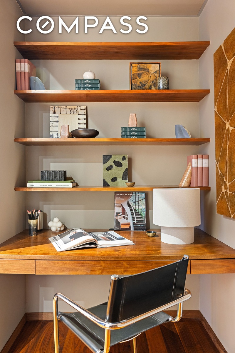 The primary suite is tucked away on the opposite end of the apartment with wood-paneled closets and an ensuite marble bathroom with a walk-in shower, separate soaking tub, and double-sink vanity. The guest bedroom, situated off the hall, also offers an ensuite marble bath with a tub / shower. The home office has been thoughtfully designed with built-in shelving, desk, and cabinetry, creating a functional and stylish workspace. This home also features a powder room, high end built-ins and wood work, a separate laundry room, hardwood floors, speakers throughout, central air conditioning, and a very large private storage unit that transfers with the apartment.