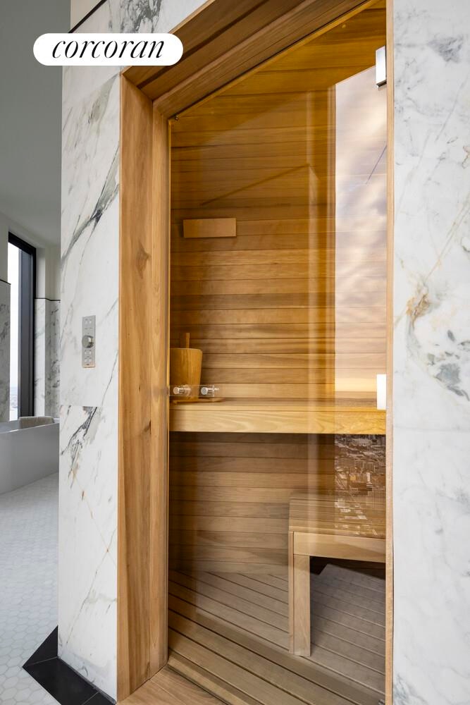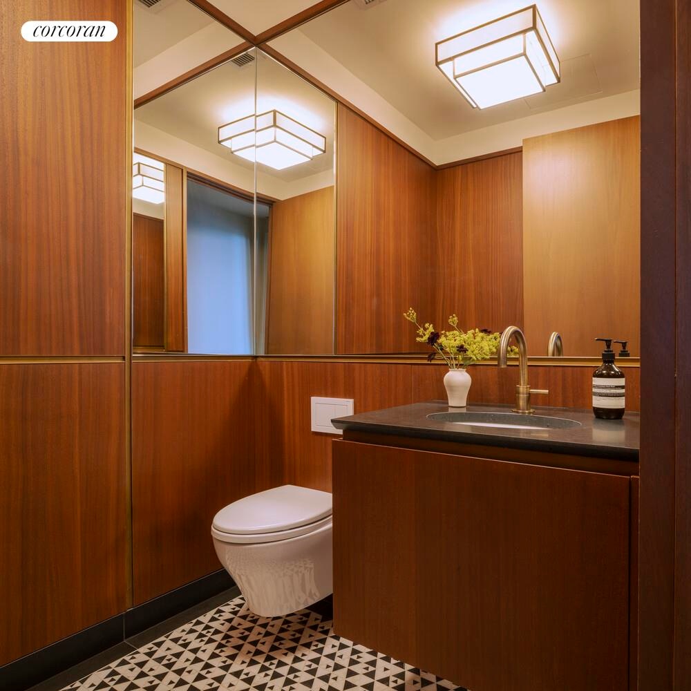Designed by SHoP Architects and with interiors curated by Gachot Studios, the residence blends architectural grandeur with intimate warmth. European White Oak floors in a custom honey stain, rich mahogany millwork, and bronze detailing create a timeless palette of sophistication. The chef's kitchen is a bold statement in luxury, featuring Absolute Black stone countertops, oil-rubbed bronze Waterworks fixtures, and fully integrated Miele appliances. The primary bath showcases large-format Honed Breccia Capria marble - each slab a unique work of natural art. A separate laundry room featuring a Miele washer and dryer adds discreet convenience.