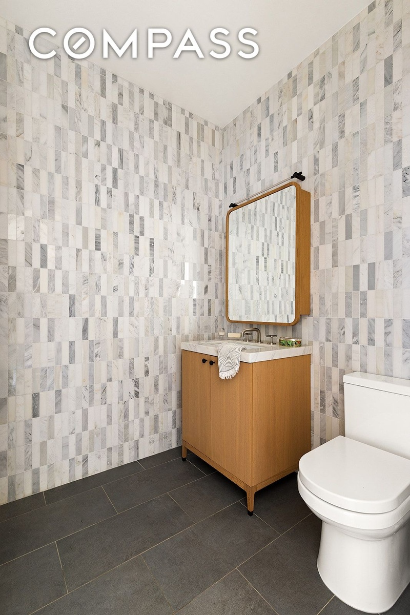 The serene primary suite is a private retreat, complete with an oversized customized walk-in closet and a luxurious five-piece en-suite bath. Designed as a true sanctuary, the bath showcases Bianco Bello marble, radiant heated Grey River marble floors laid in a striking chevron pattern, a bespoke white oak double vanity, a cast-iron soaking tub, and custom fittings by Waterworks. Two additional bedrooms are generously proportioned with ample closet space, ideal for guests, a home office, or evolving lifestyle needs. Deep customized closets throughout ensure effortless organization, while filtered water and NEST thermostats provide modern comfort and convenience. A private storage unit transfers with the sale.