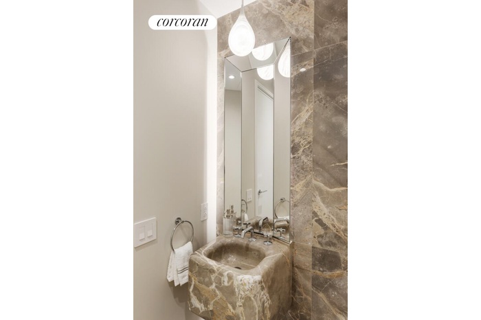 The north-facing primary bedroom boasts ample closet space, an en-suite bathroom elegantly ornamented with Bianco Dolomiti and Calacatta Gold marble and Toto Neorest water closets. T Waterworks fixtures are throughout. Residence features include 5" solid oak plank quartered and rifted flooring, 4 pipe HVAC for year-round climate control.
