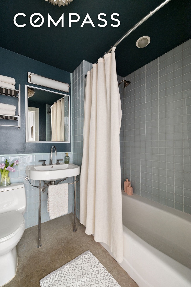 The primary suite is quiet and inviting, featuring custom closets and a skylight that fills the room with sunlight. All windows throughout the apartment have been upgraded to CitiQuiet windows, providing ample natural light while maintaining exceptional quiet and energy efficiency.