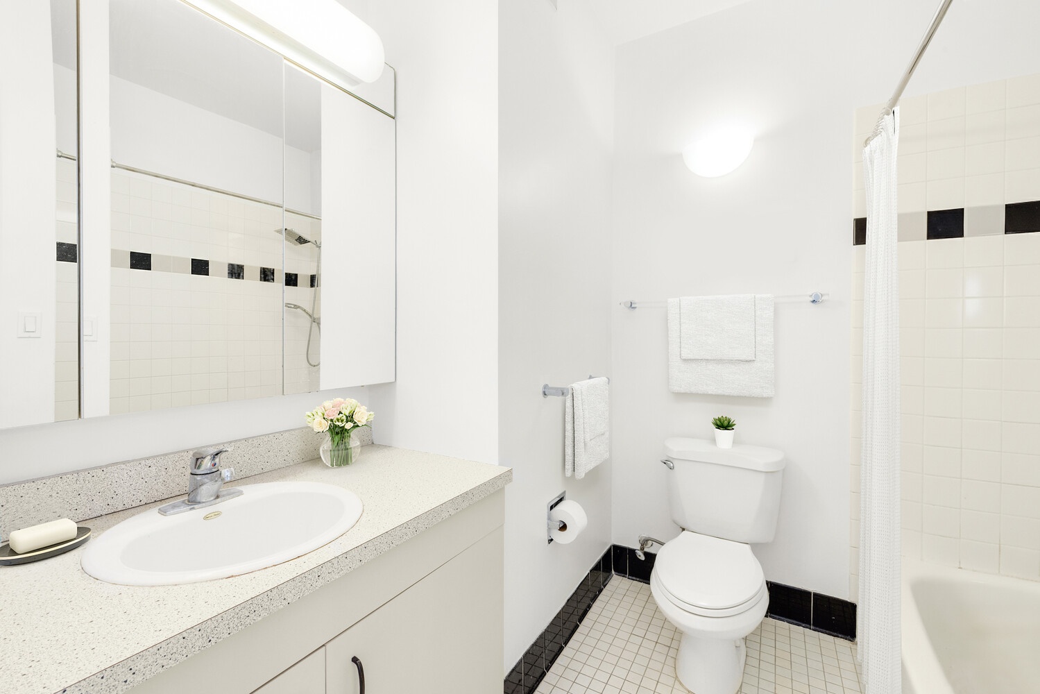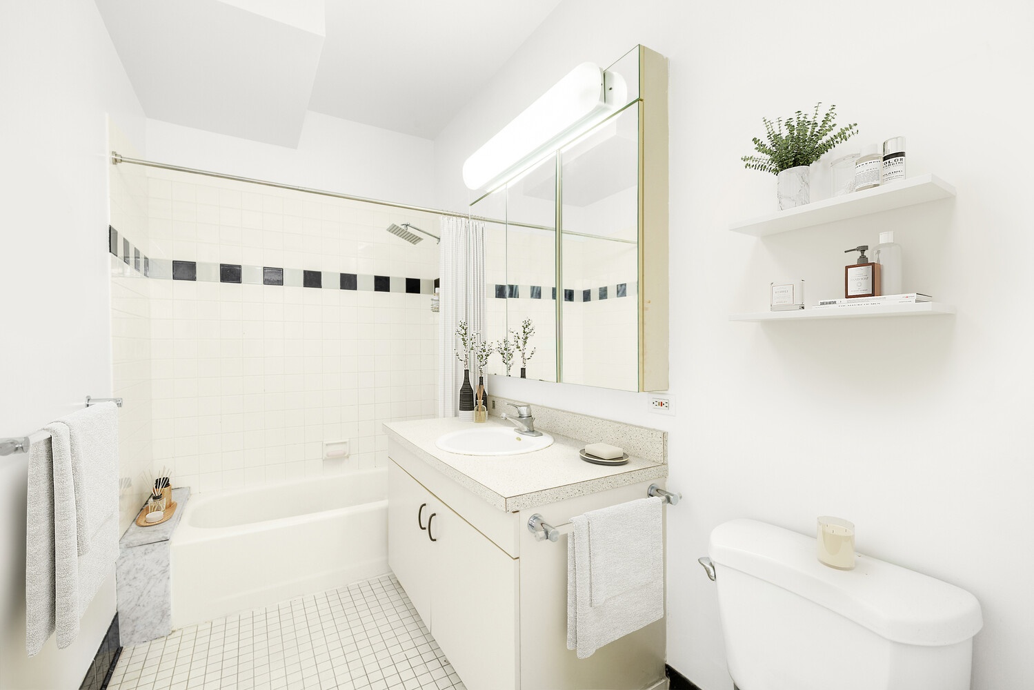 The primary bedroom suite comfortably accommodates a king-size bed and additional furnishings, with flexibility for a home office nook or seating area. It is complemented by a well-appointed en-suite bath and a large custom closet. The second bedroom, thoughtfully situated on the opposite side of the living room, provides excellent separation and privacy, with a full bathroom conveniently located just outside the room. Both bedrooms enjoy the same coveted western exposure as the living room, delivering beautiful light and breathtaking Hudson River sunsets each evening.