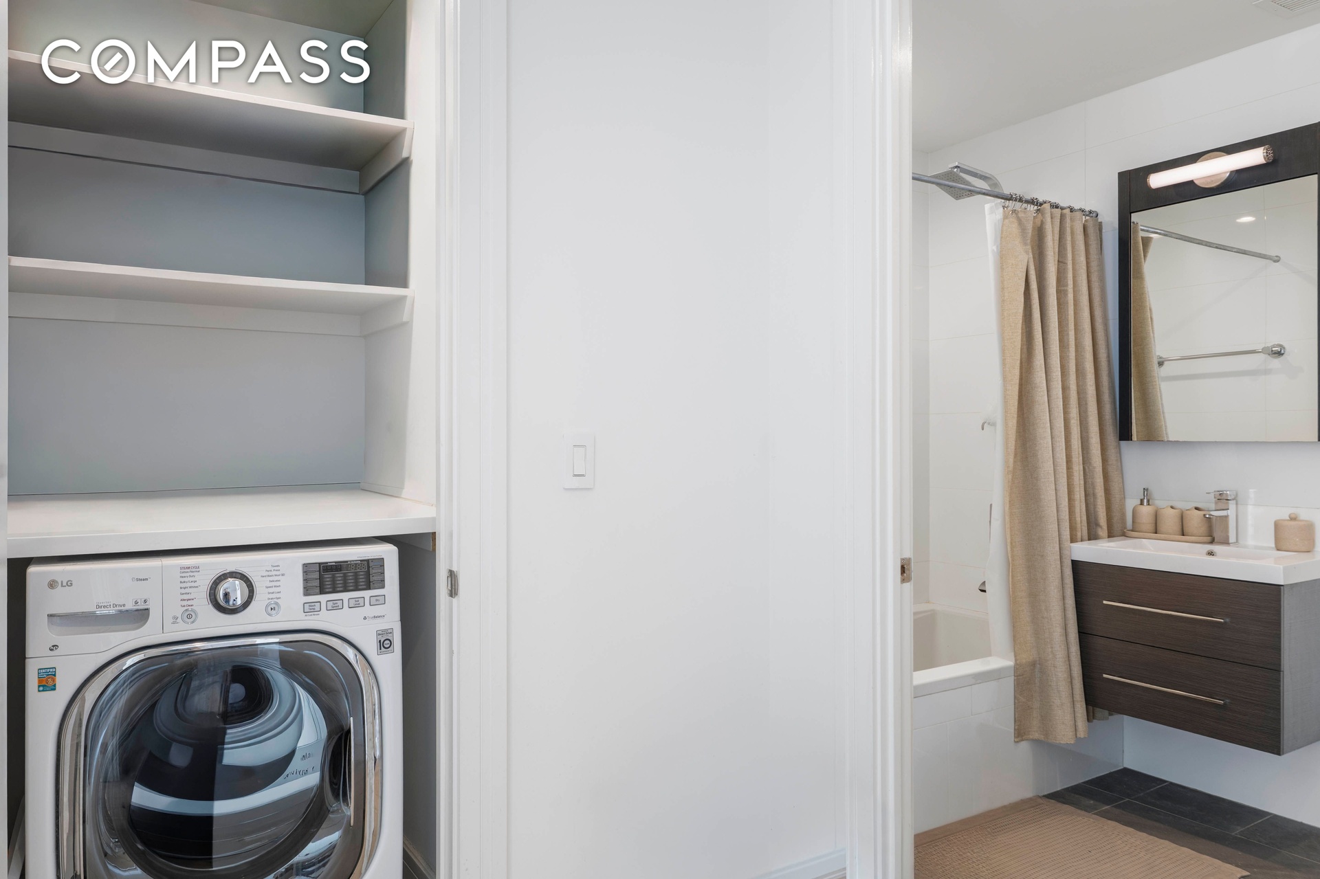 The thoughtfully designed kitchen boasts custom cabinetry, a Porcelanosa backsplash, a Bertazzoni vented range, a Liebherr refrigerator, a Viking dishwasher, and a brand-new microwave. Additional conveniences include a washer/dryer combo unit (with the option to upgrade to a stackable set), a storage closet in the living and kitchen area, a Lutron lighting and automated solar shades system, and a remote smart lock for effortless entry.