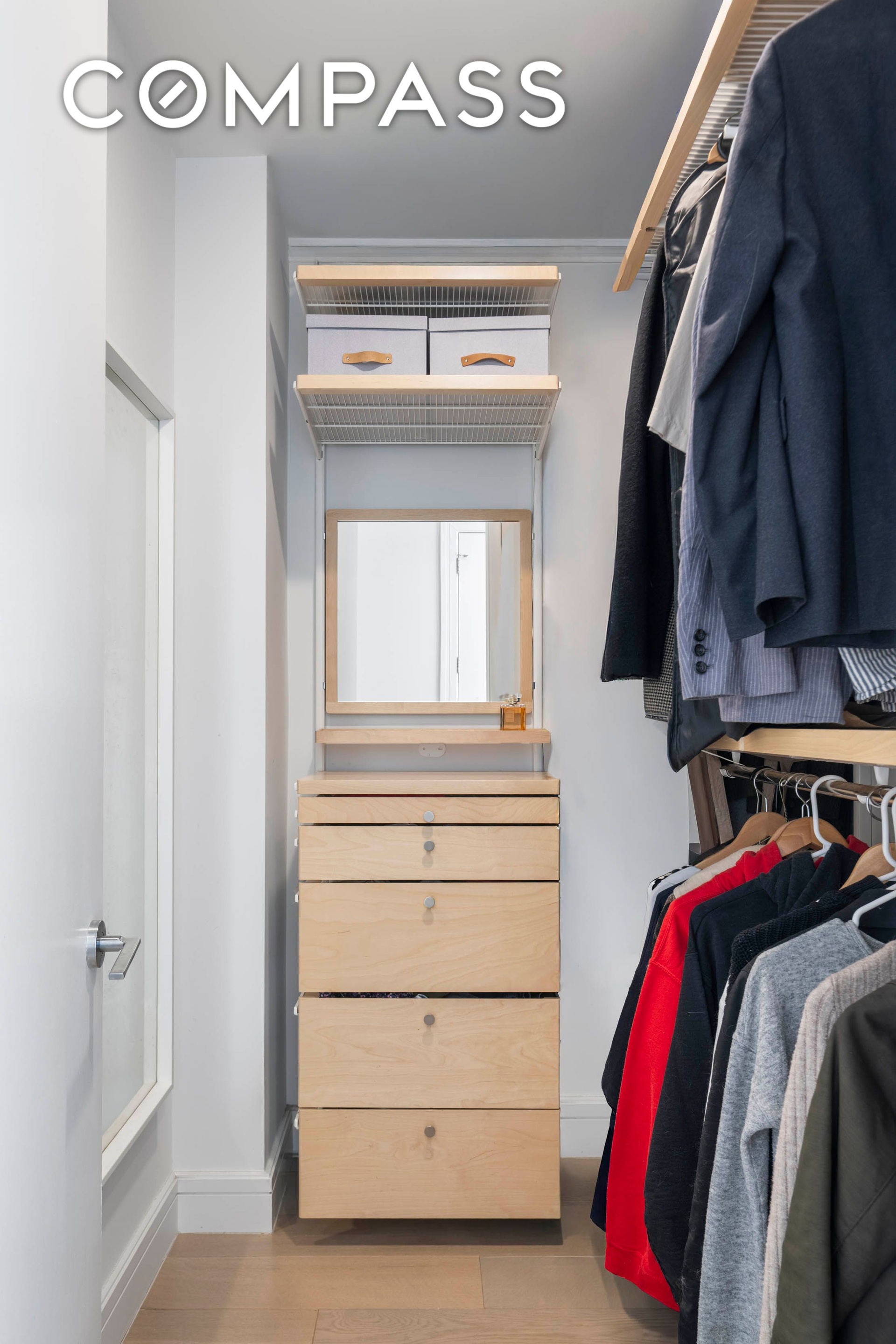 The extra-large primary bedroom includes a custom built-in walk-in closet system and an en suite bathroom with an enlarged vanity and a spacious shower. The second generously sized bedroom also features a custom built-in closet, and the second bathroom offers radiant heated floors and a deep soaking tub.