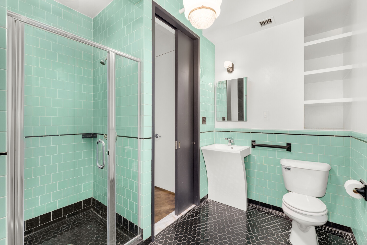 Tucked quietly at the rear of the residence, the primary suite offers three generous closets and an oversized bath featuring dual sinks and spa-quality shower. The secondary bedroom stretches over 20 feet and includes an ensuite bath with convenient secondary access from the entry hall. A powder room off the living area completes the thoughtful layout of a home designed to exceed expectations at every turn.