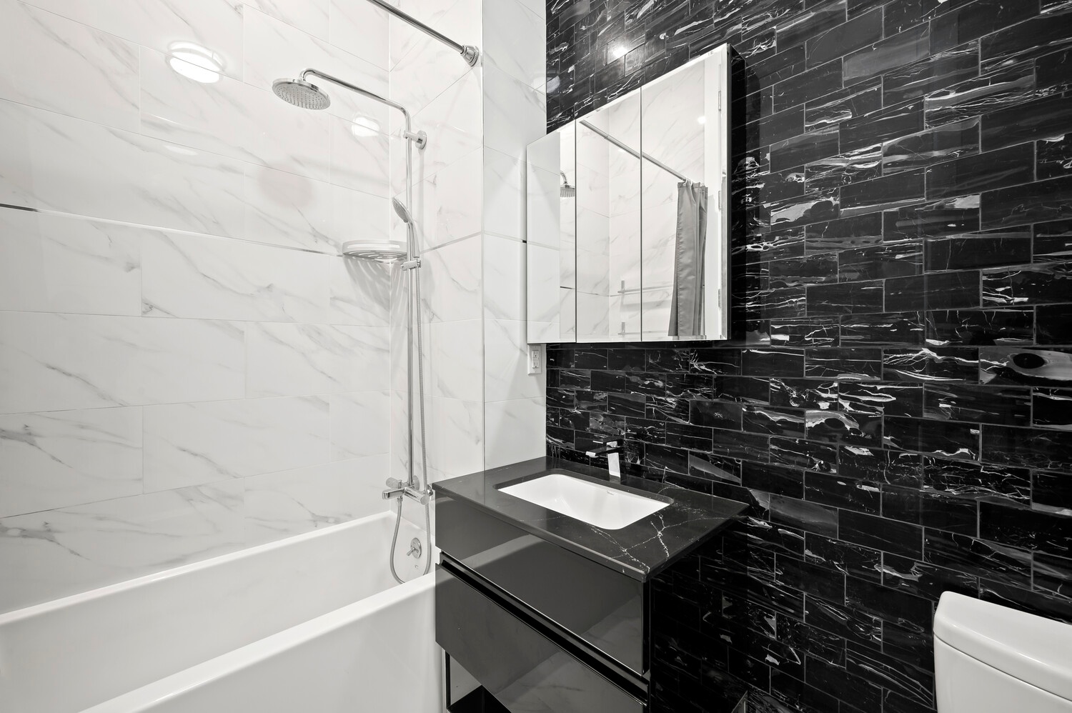 To your left, double-decker Scavolini custom kitchen cabinetry, white marble countertops, a vented Bertazzoni stove, concealed Bosch dishwasher, and Delta Touch faucet await you in your entertaining chef's kitchen. To your right is the in-unit Bosch washer & dryer, spa-like bathroom with dramatic black marble with Toto and Grohe fixtures, plus a fully customized 10.5' tall closet.