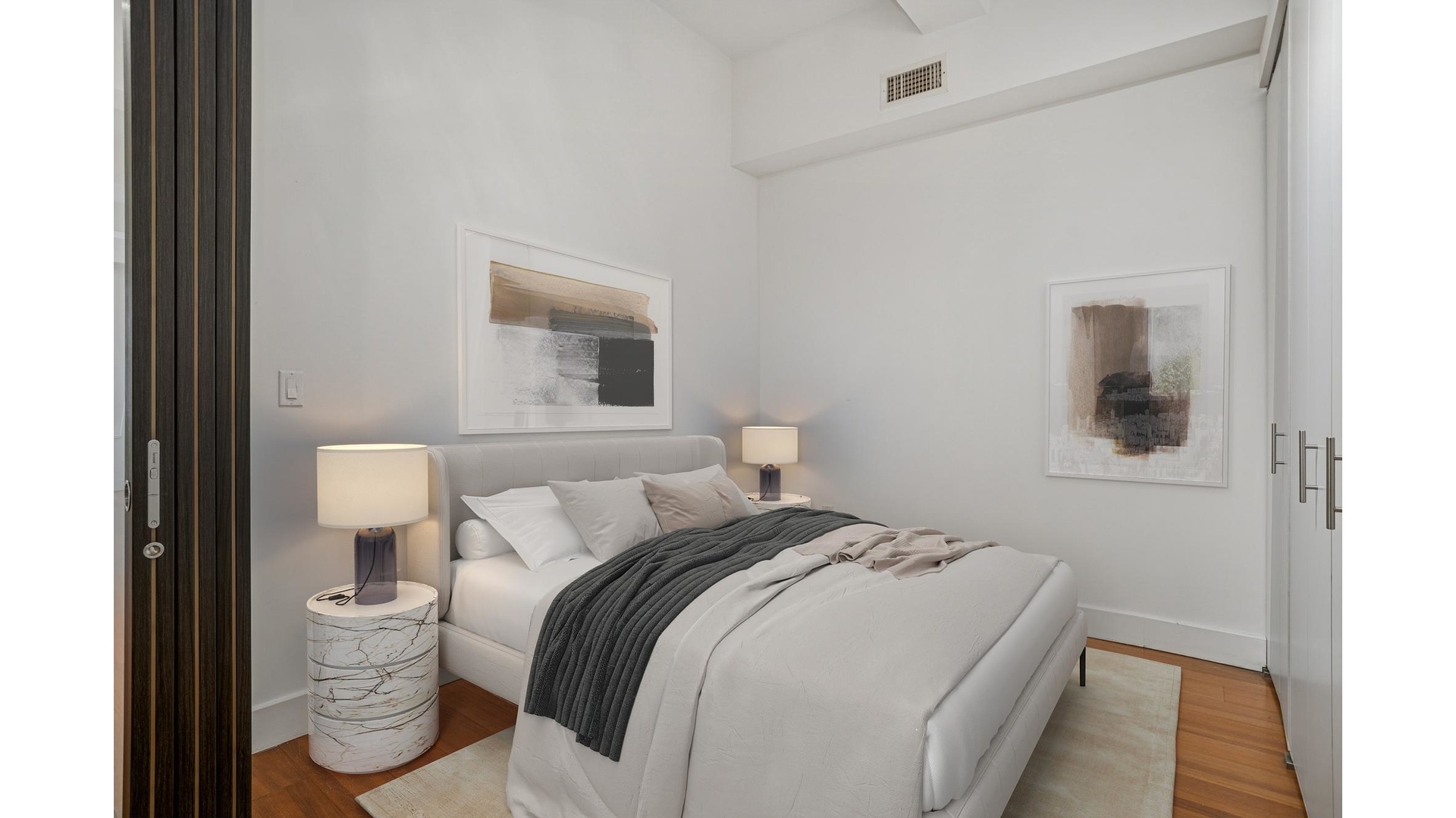 Residence 10E is an ideal pre-war loft for downtown living. Located in prime Financial District, this gracious junior one-bedroom features hardwood floors throughout, soaring 10'8" ceilings, oversized windows, ample storage/shelving, beautiful finishes, and a separate alcove sleeping area complete with a modern sliding door and closets. The oversized living area easily serves both dining and entertaining needs. The top-of-the-line, modern open kitchen features white lacquer cabinets, dark countertops, a Liebherr refrigerator, Bosch dishwasher, Bosch stove, and a GE Profile microwave.
