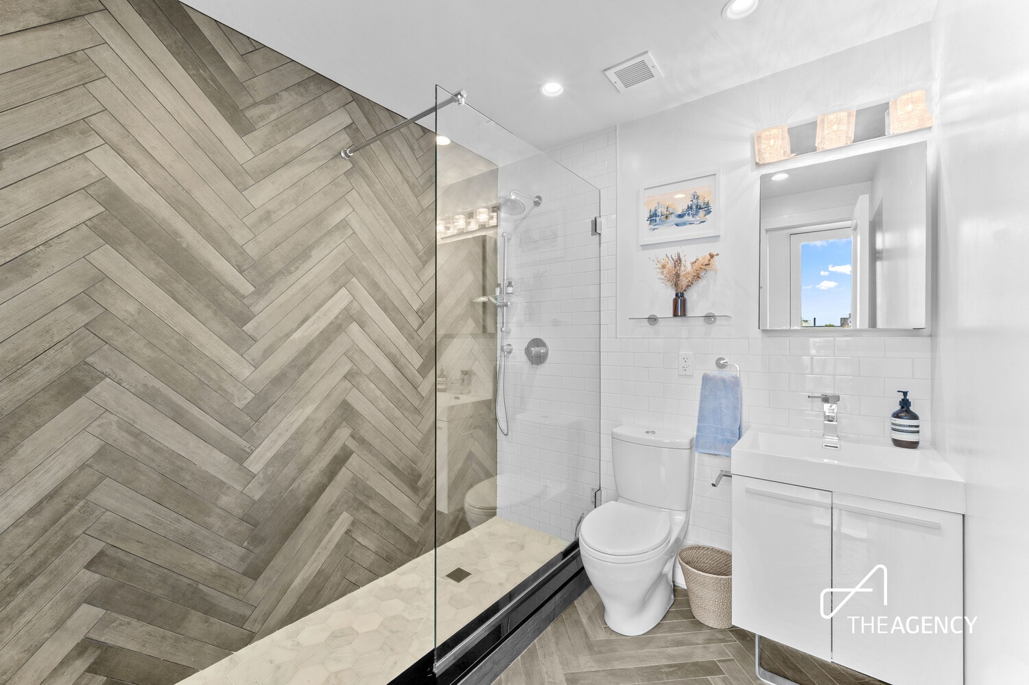 On the upper level, the primary bedroom serves as a private escape, with doors opening to a fully private terrace accessible from both the bedroom and the upstairs foyer. The terrace features a custom outdoor kitchen with a fridge and grill, creating an inviting space for entertaining or relaxing. The second full bathroom on this level offers spa-like features with a glass-enclosed shower, floor-to-ceiling tile, and radiant heated floors.