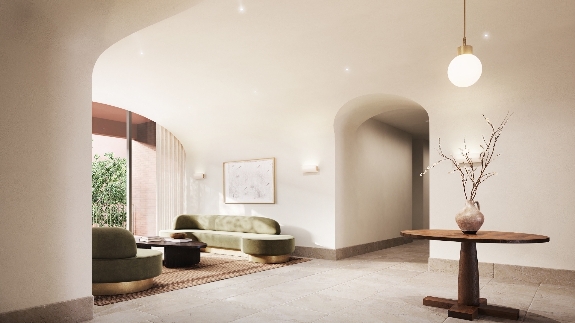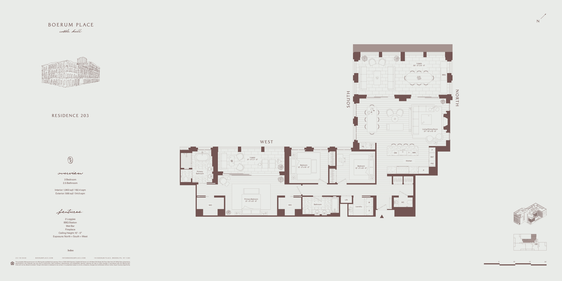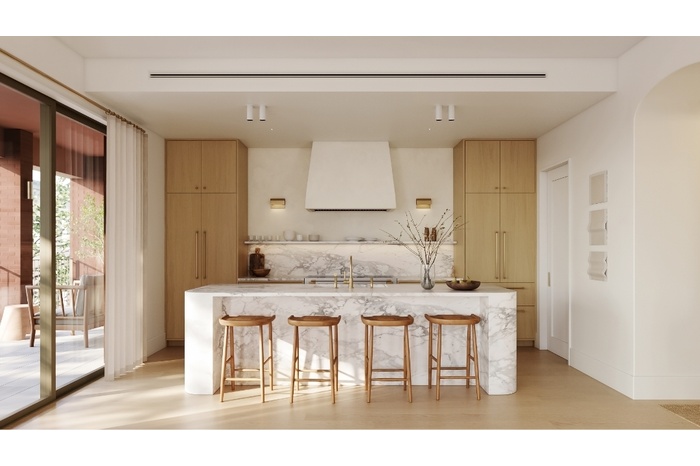 Introducing Residence 203, an expansive three-bedroom, two-and-a-half-bathroom home offering 1,963 square feet of interior living space and 588 square feet of private outdoor space, seamlessly designed for indoor-outdoor living. A gracious loggia off the living room and a second loggia off the primary bedroom both overlook the building’s beautifully landscaped courtyard, creating tranquil extensions of the home.