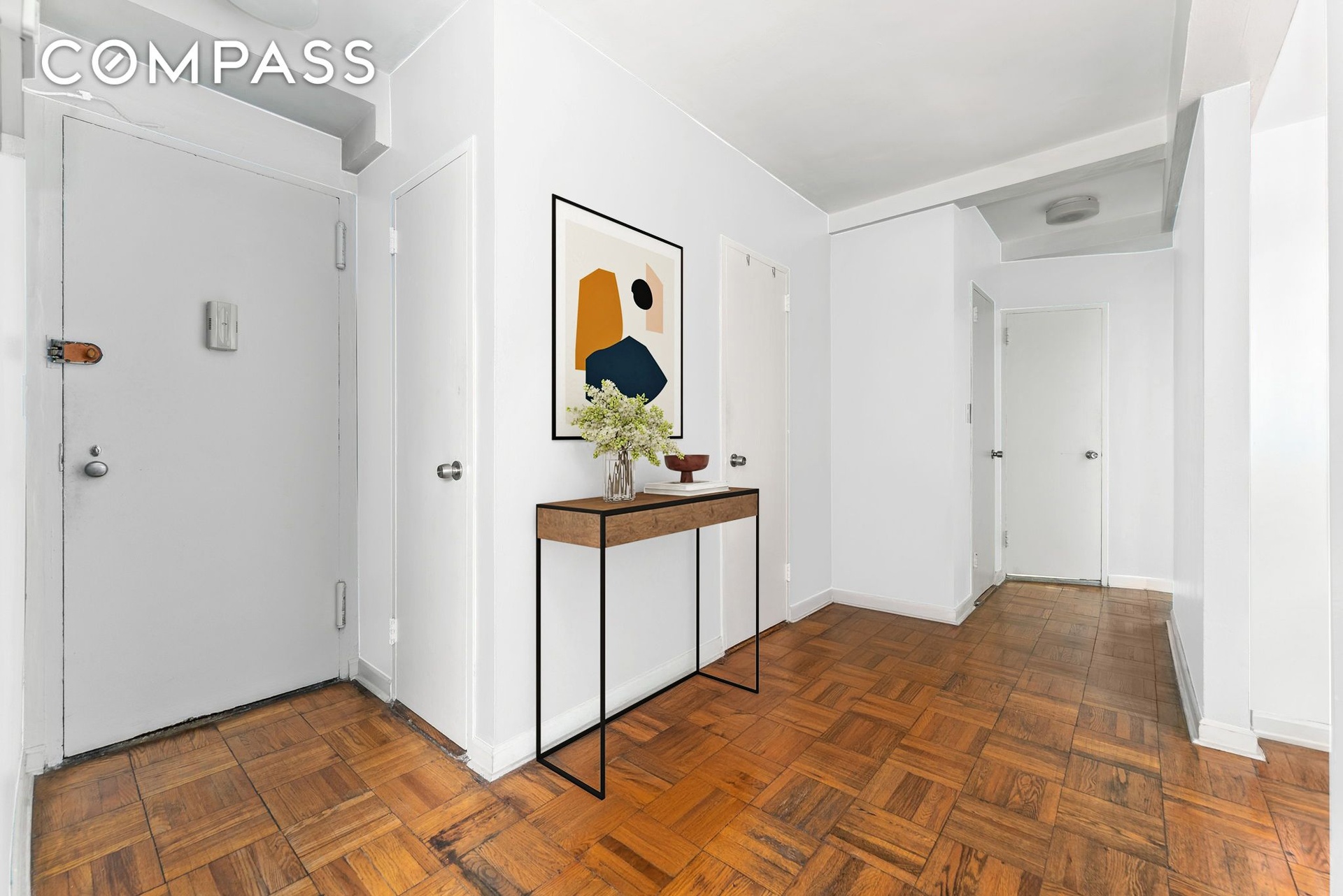 This extra-large, sun-filled corner 1-bedroom, 1-bath apartment offers one of the best layouts in the building. With south and east-facing exposures, the living room is bright and open with expansive, unobstructed downtown views. The windowed eat-in kitchen comfortably fits a dining table for four, and the entry foyer is large enough to double as a home office.