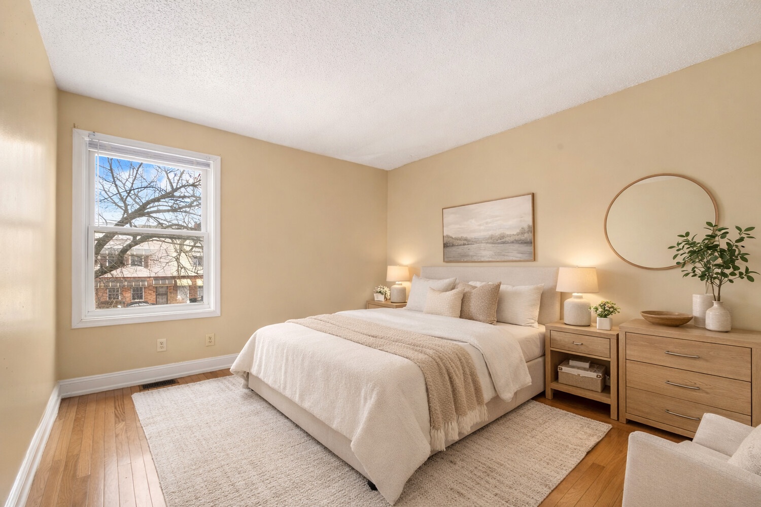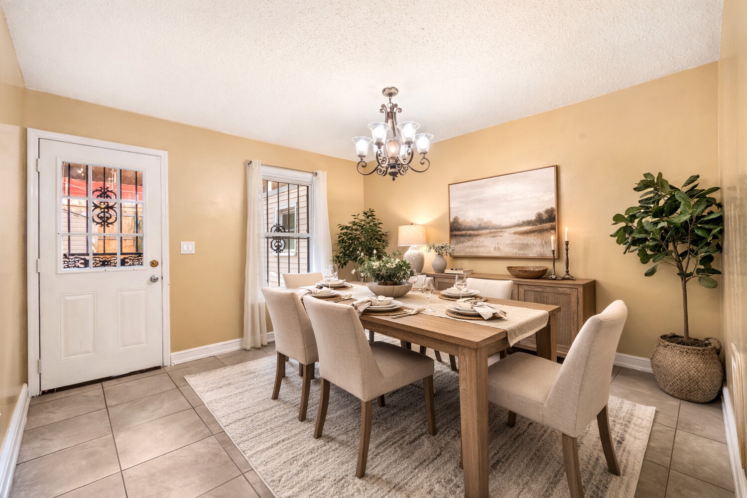 The main level features a generously sized living room with excellent closet space and seamless flow for everyday living. A stylish powder room adds convenience for guests. Just beyond, a dedicated laundry room, a well-proportioned dining area that comfortably seats six, and an updated kitchen with stainless steel appliances and abundant counter space create a layout designed for both comfort and entertaining.