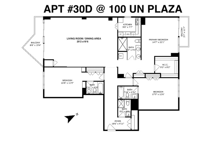 Perched high above Manhattan in the famous 100 United Nations Plaza, Residence 30D is an expansive and beautifully proportioned three-bedroom home with spectacular light, generous entertaining space, and multiple balconies.