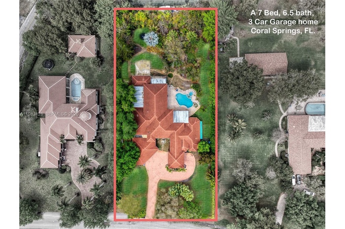 Welcome to this exceptional private estate in the prestigious Hills of Coral Springs, set on over an acre of beautifully landscaped grounds offering space, privacy, and a true resort-style lifestyle. This expansive residence features 6 spacious bedrooms, 6.5 bathrooms, plus an additional bedroom in the detached guest house, making it perfect for large families, hosting guests, or multigenerational living.