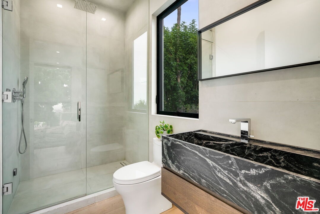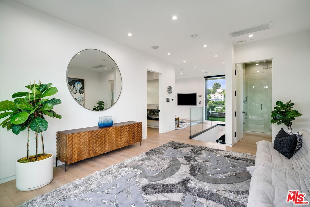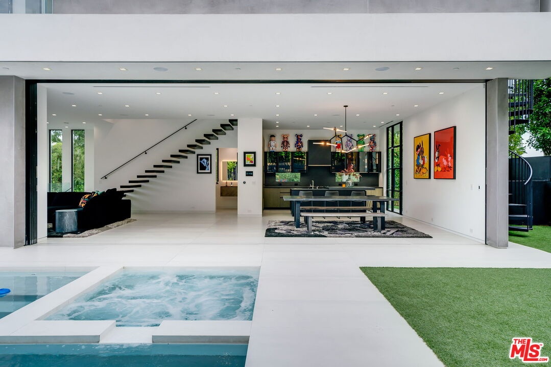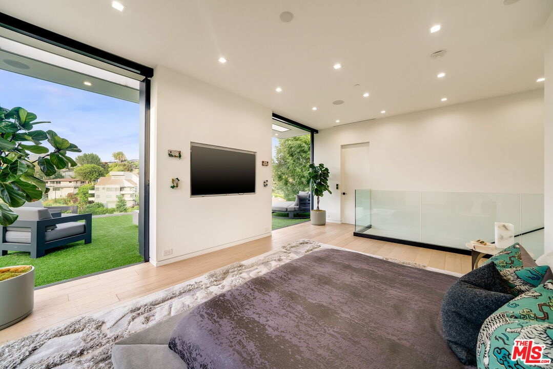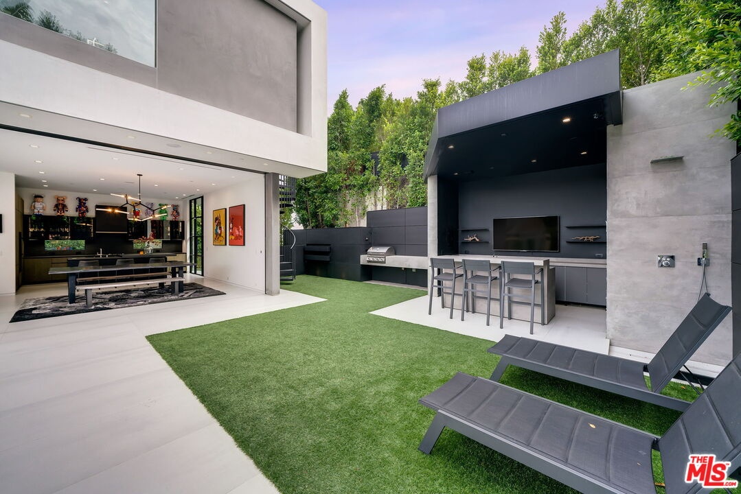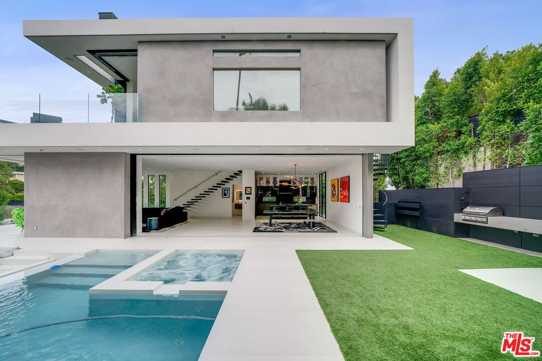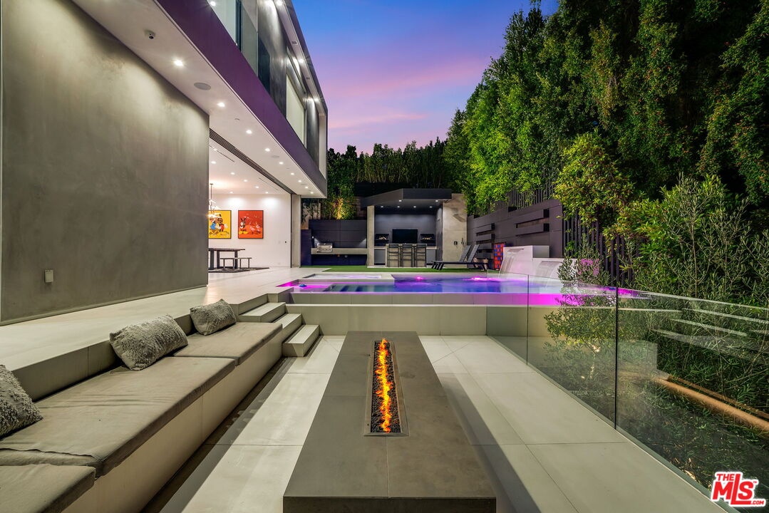 This multi-tiered modern sited hillside home embraces the Hollywood/Beachwood area with full advantage of the city lights and scene stealing views of the Hollywood Hills iconic signage. Constructed in 2019, this homes meticulously planned architectural design maximizes natural light and has features of a height grand great room, open concept living with full floor to ceiling windows, complete with access to indoor/outdoor extensive entertaining grounds. The Chef's kitchen, includes, leather countertops, Italian porcelain floors, Miele appliances, and a sizable island with suitable seating. The great room opens to a relaxing atmosphere where you can swim in the in-ground pool, spa, and dine in the outdoor kitchen with an exterior powder room for you and your guests to relax and enjoy. The private primary suite has a lounge, private deck with it's own fire pit, and night life views with dual bathrooms featuring Porcelanosa vanities, Poliform closet, a grand soak-in tub with a separate steam shower. An additional feature includes an elevator which purposely brings you to every floor of your choosing while rounding out this unique interior with features of multi level patios, decks for private gathering spaces, and repurposed speak easy outdoor living with an abundance of low maintenance turf! There is a temperature controlled wine room, 2 garages: (1) 2 car garage, and (1) 1 car garage with 2 exterior parking spaces allowing for a total of 5 parking spaces on property. Completing the amenities is a Control 4 system which allows you to personally control the home with complete ease. If you want more, there is more! There is a roof top deck with 270 degree views, outdoor fire pit, complete with a kitchen allowing for an abundance of Hollywood Sunsets! This is the best the Hollywood Hills has to offer and you must preview to witness how you can make this your own!