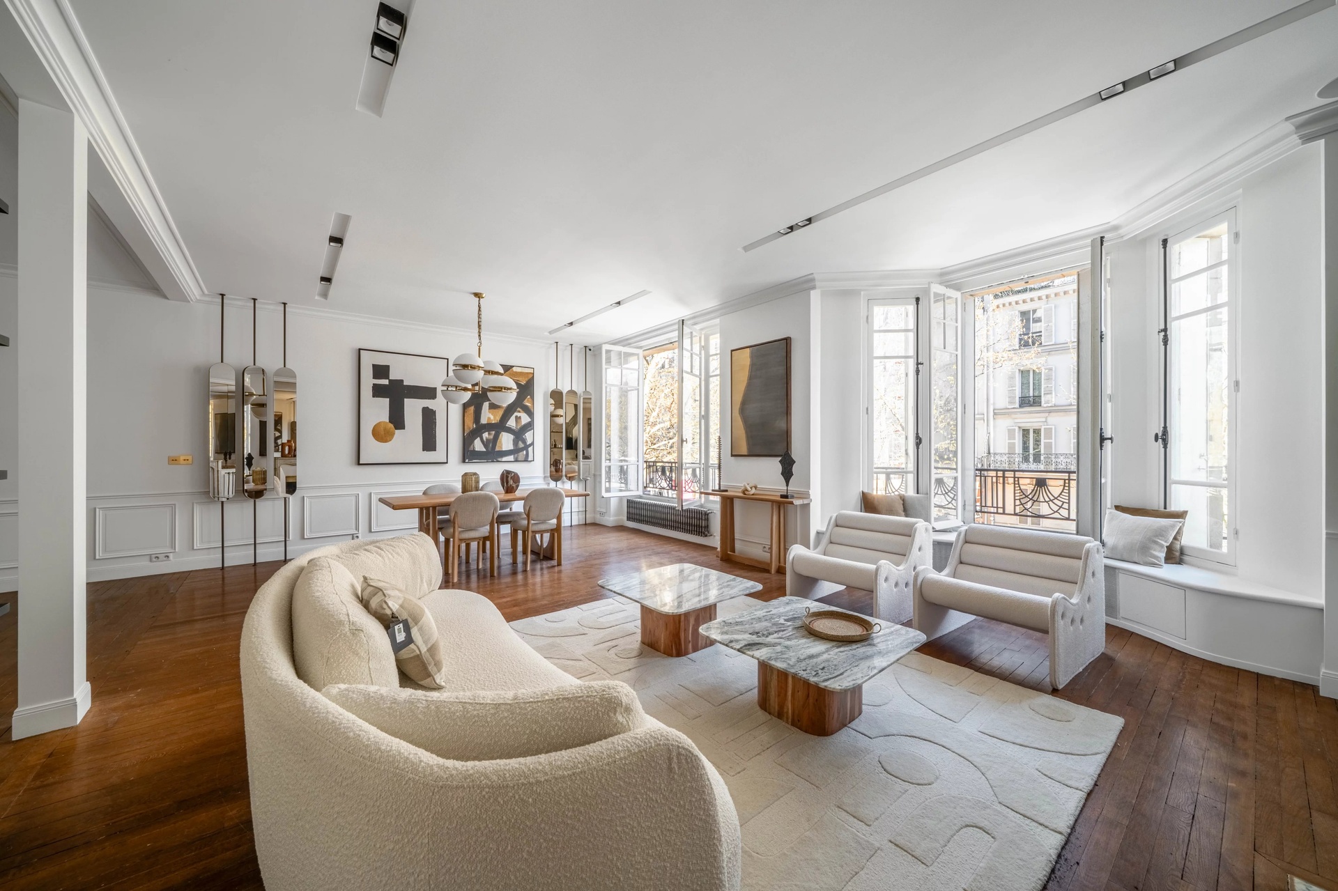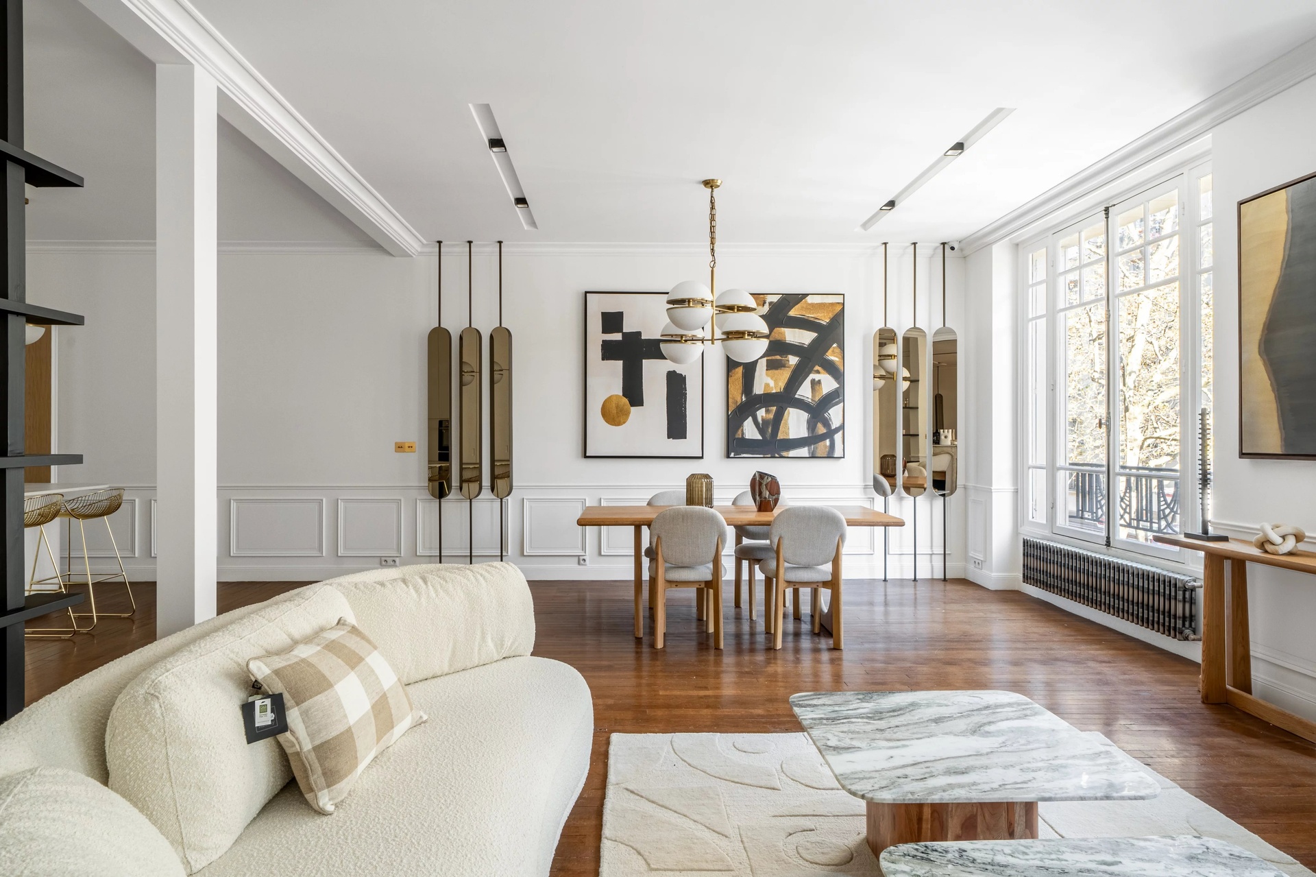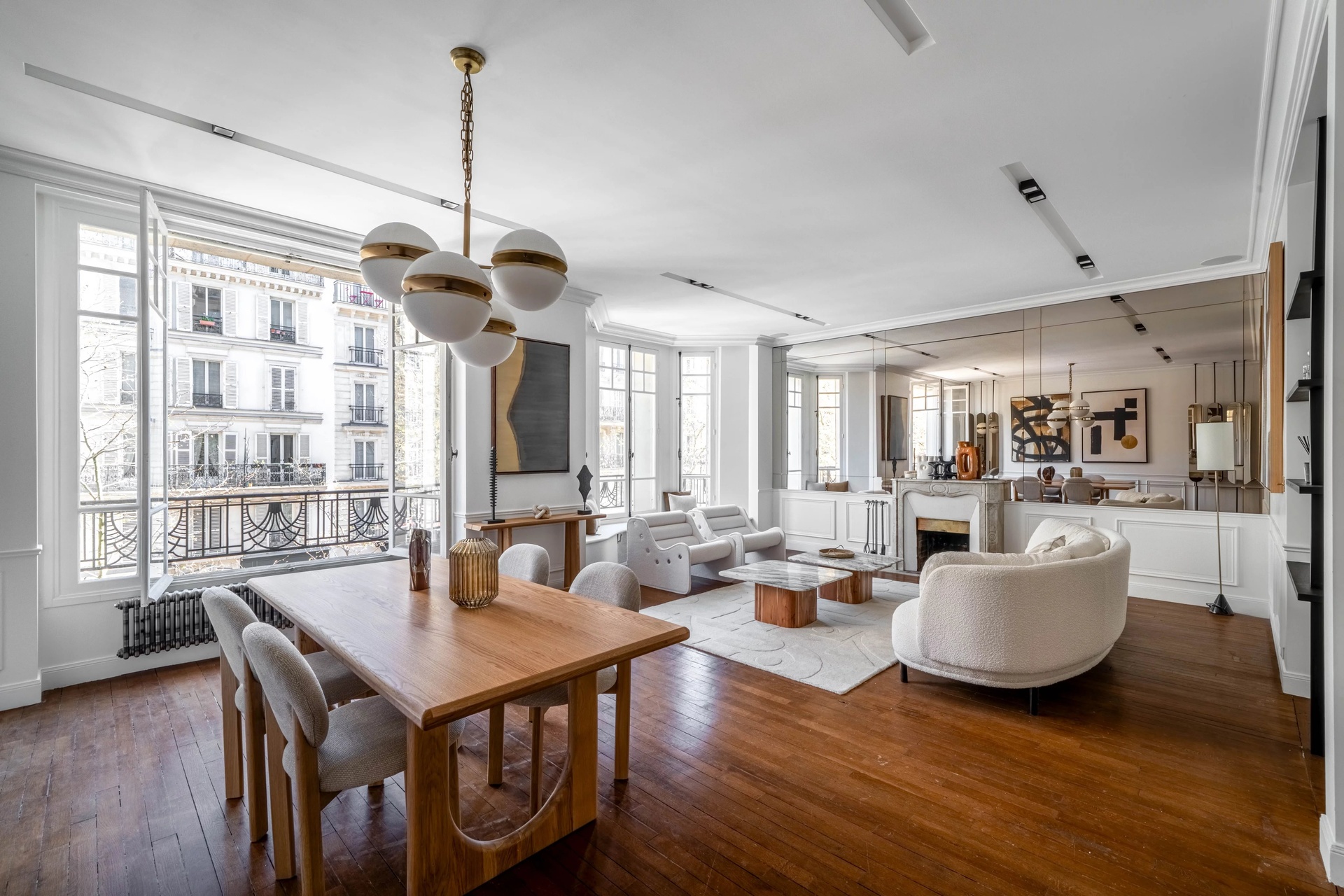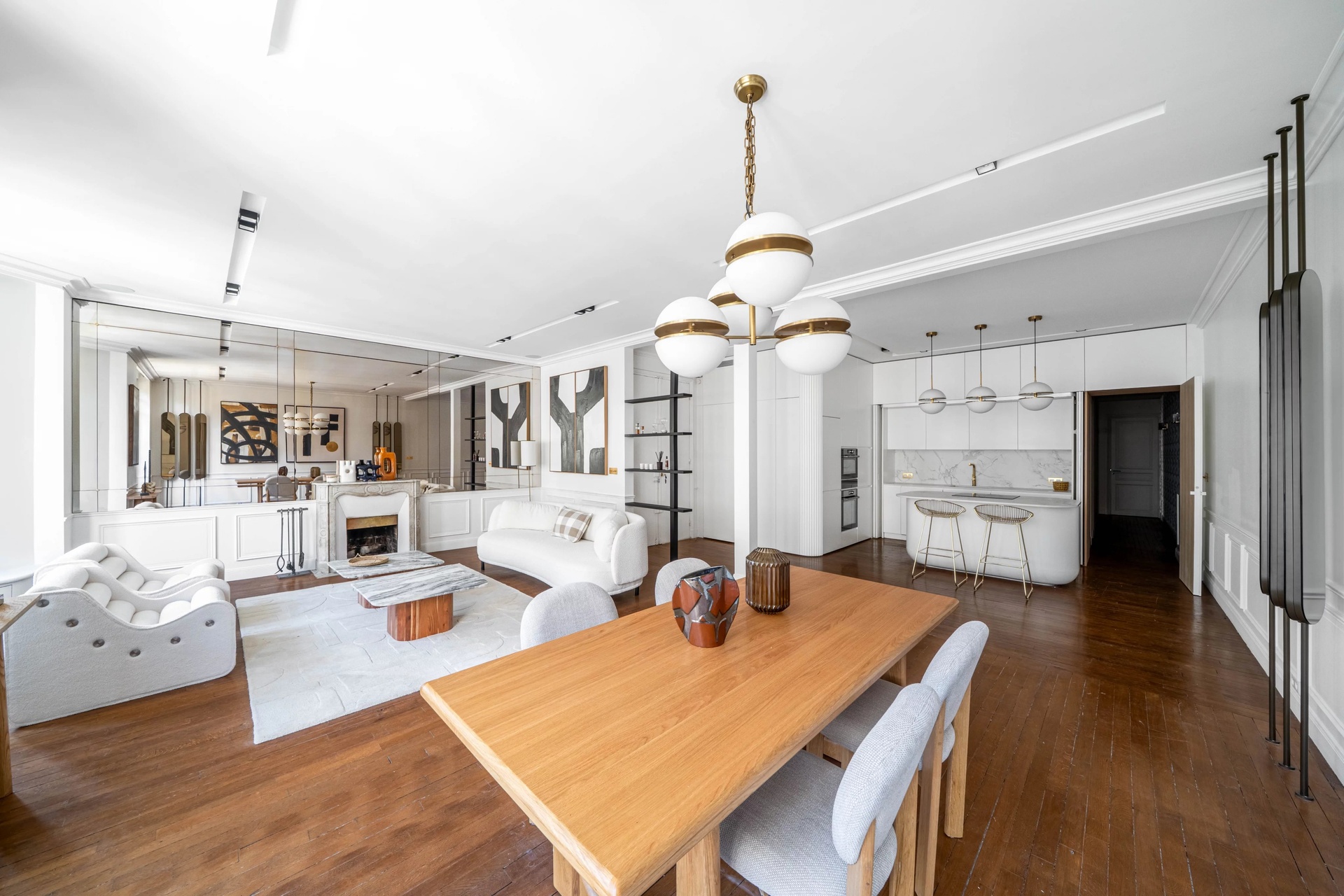 Located in the prestigious Gros-Caillou district of Paris 7th, this splendid 127 m2 apartment offers the perfect blend of classic Parisian charm and contemporary refinement. The spacious living and dining area features wide windows that bathe the interiors in natural light, complimented by elegant wood floors, chic modern décor, and a stunning decorative fireplace as a centerpiece.