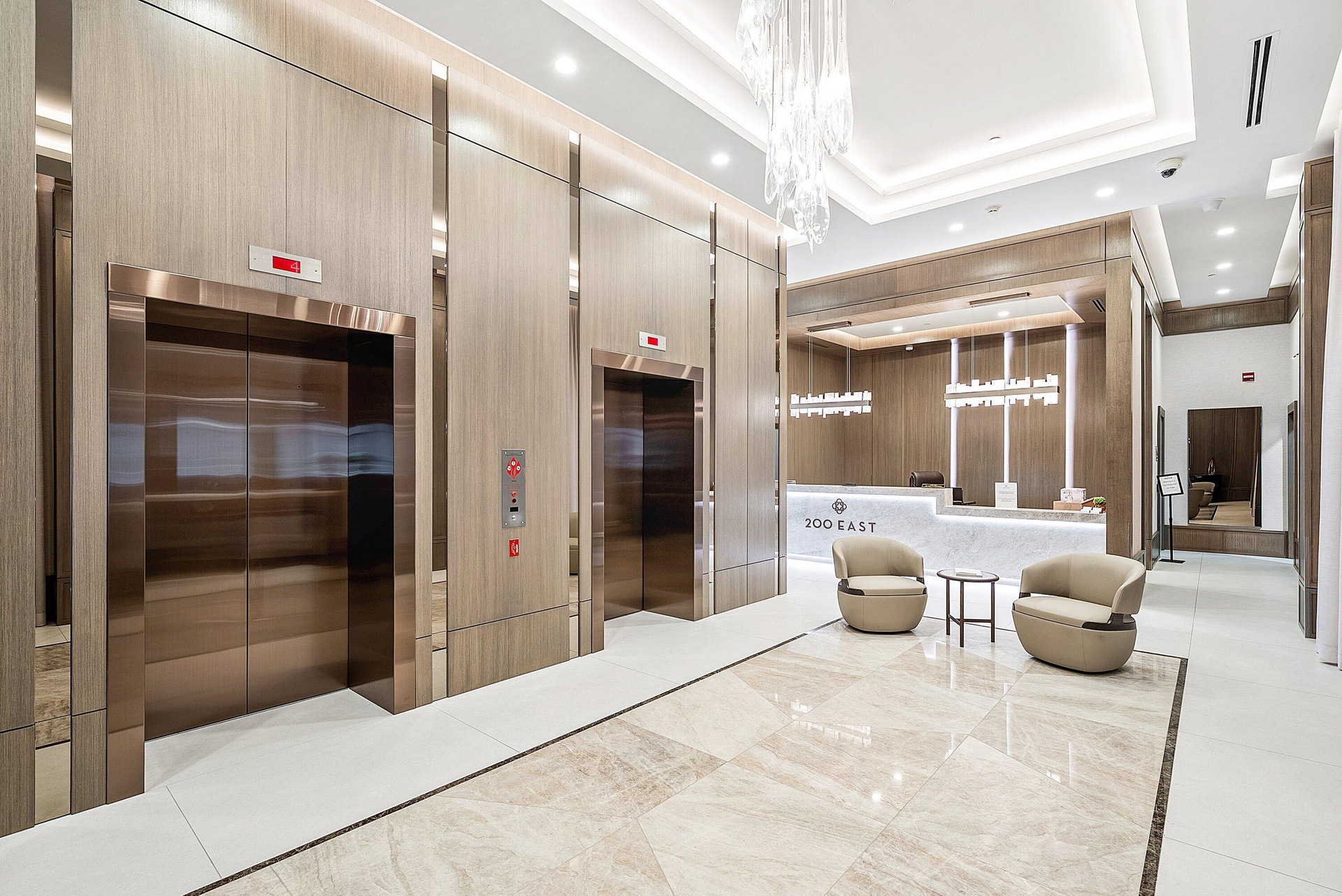 Step into this exceptional two-level residence spanning over 3,200 square feet, where a refined New York-inspired aesthetic sets the tone from the moment of entry. This sophisticated three-bedroom, two-and-a-half-bath corner residence offers the rare luxury of a private interior elevator and is thoughtfully designed for both elegant entertaining and comfortable everyday living. The expansive main level showcases an open-concept living and dining area, complemented by a generously sized family room just off the gourmet kitchen—creating a seamless flow throughout. Soaring 10-foot ceilings and dramatic floor-to-ceiling windows flood the space with natural light, enhancing the home's airy, modern feel. A large covered balcony extends the living space outdoors, ideal for relaxing, grilling, or hosting guests. Upstairs, the residence continues to impress with a sprawling primary suite featuring a dedicated sitting area and a beautifully appointed en-suite bath. Two well-proportioned guest suites share a bath, while an additional flex space offers the perfect setting for a home office, den, or playroom. Two assigned garage parking spaces are conveniently located just steps from your front door, completing this elevated and effortlessly livable home.