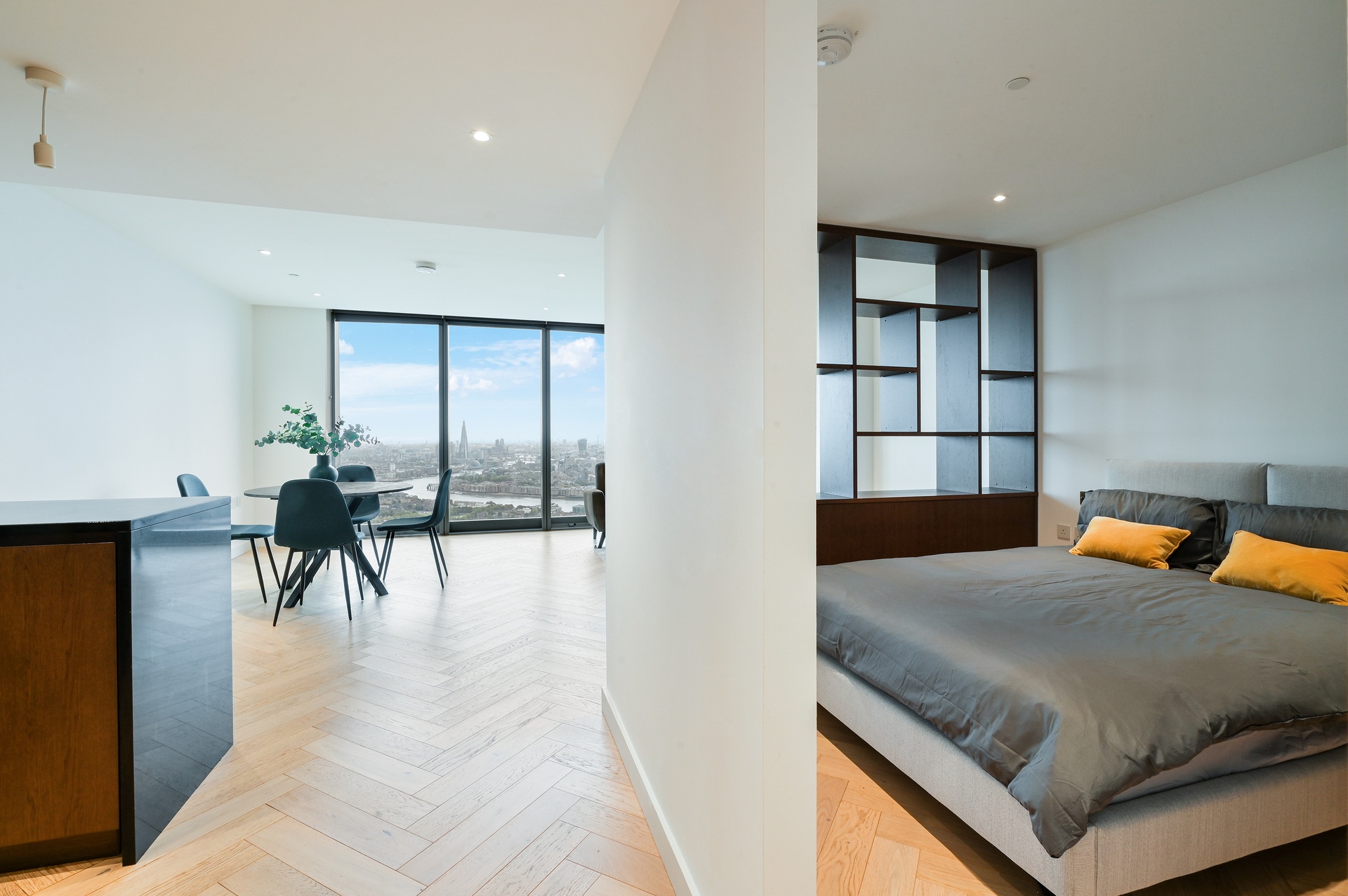 Thoughtfully designed to maximise both space and flow, the apartment features a cleverly integrated layout with bespoke shelving that subtly separates the sleeping area from the main living space. This creates a natural sense of privacy while maintaining a bright, open-plan environment.